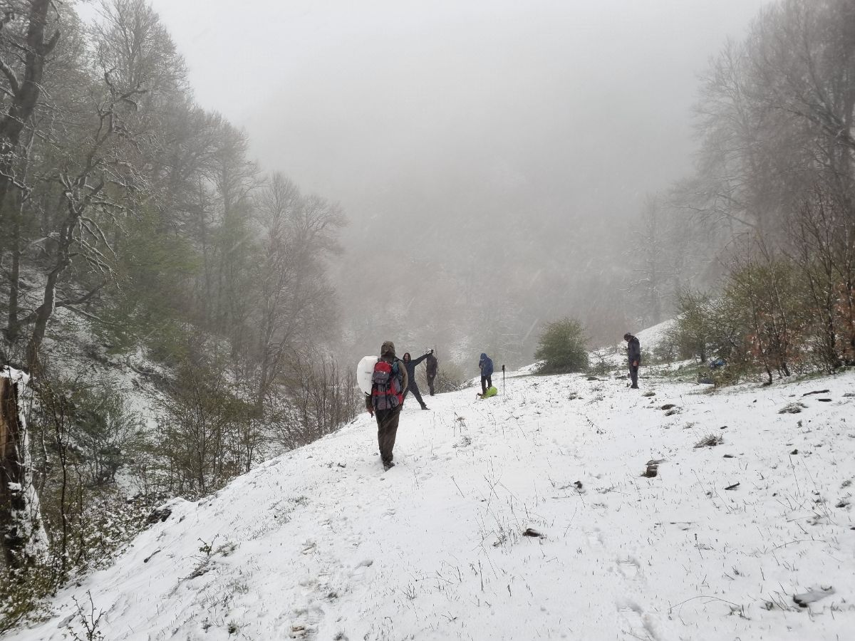 در ابتدا که از اروست راه افتادیم هوا و محیط، یادآور خزان بود که باران یا برف های بسیار ریزی را به همراه داشت. در همان ابتدا دو پیرزن و یک پیرمرد با لباس های زیبا و محلی مازنی را دیدم که بسیار کیف کردم. پس از شاید یک ساعت صعود به جایی رسیدیم که از دور کوهی سپید پوش به چشم میخورد که در میان کوه های سبز نزدیک بسیار زیبا جلوه میکرد. هرچه جلوتر میرفتیم سپیدی درخت ها بیشتر و بیشتر میشد و برف آرام آرام روی برگ و شاخهی درخت ها بیشتر خودنمایی میکرد.