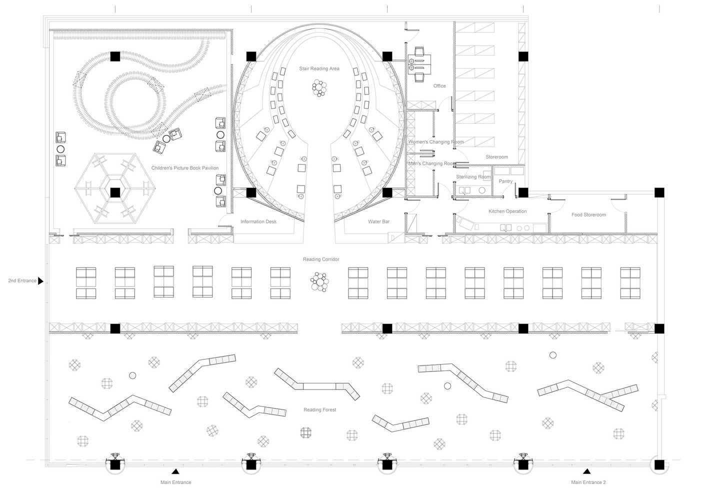 هدف طراحان از این چیدمان، تداعی جنگلی است که در آن «ستونهای درختمانند»، بلند ایستادهاند و نور دانش را ساطع میکنند. این ستونها به گونهای بلند ایستادهاند که توسط سقف آینهای به سمت بالا منعکس میشوند، پس بهخاطر دیوار آینهای در پشت، فضا را با ابعاد بیپایان جلوه میدهد.
