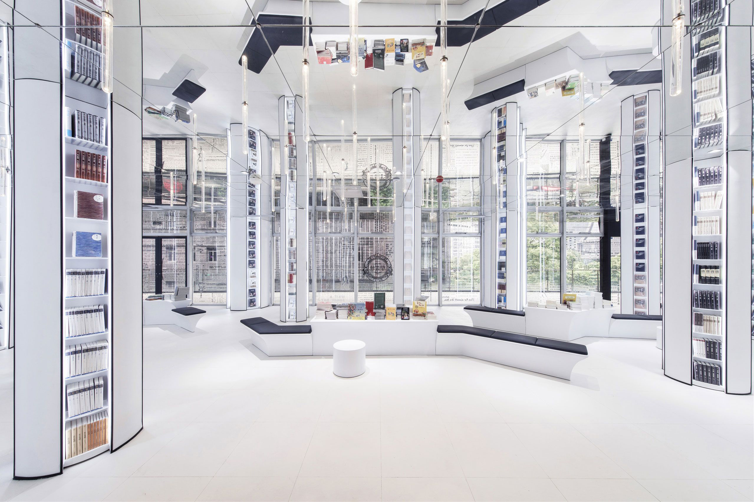 این فروشگاه از چهار فضای مجزا تشکیل شده است. بازدیدکنندگان ابتدا با یک نمای شیشهای پوشیده از کتاب روبرو میشوند که پشت آن، سالنی کاملا به رنگ سفید امتداد یافته است. ستونهای دایرهای به صورت تصادفی در این فضا قرار گرفتهاند که کتابها را در قفسههای عمودی نورانی به نمایش میگذارند؛ با نیمکتهای باریکی که به صورت زیگزاگ از میان آنها عبور میکنند.