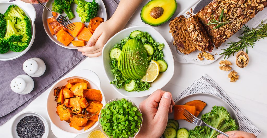 حبوبات، غلات کامل، مغزها، دانهها، سبزیجات و میوهها منابع غنی پروتئین، آهن، کلسیم و سایر ریزمغذیها هستند. امروزه جایگزینهای گیاهی گوشت و لبنیات نیز بهسرعت در حال گسترشاند.