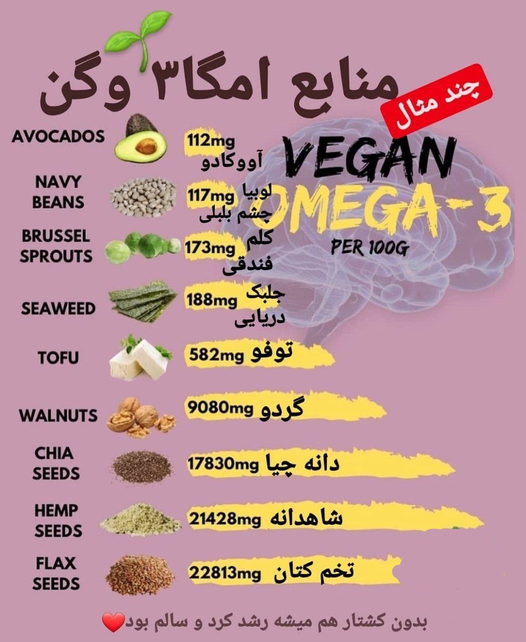 دانهی کتان، چیا، گردو و روغن کلزا منابع عالی امگا-۳ گیاهیاند، بدون خطر جیوه.
