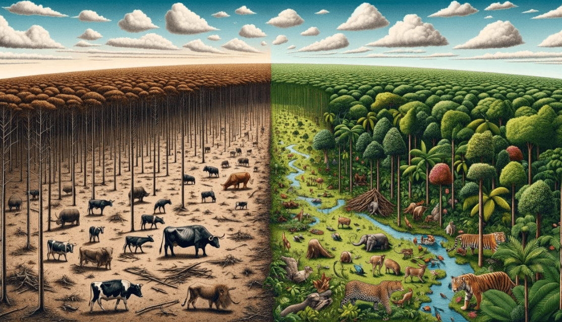 صنعت دامداری یکی از بزرگترین تولیدکنندگان گازهای گلخانهای است. طبق گزارشهای Food and Agriculture Organization، دامداری سهم قابل توجهی در انتشار متان، مصرف آب و تخریب جنگلها دارد. برای تولید یک کیلوگرم گوشت گاو، هزاران لیتر آب مصرف میشود. علاوه بر آن، جنگلزدایی برای ایجاد مراتع و کشت خوراک دام، تنوع زیستی را تهدید میکند.