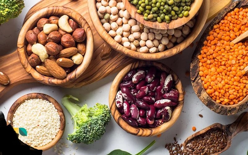 حبوبات (عدس، نخود، لوبیا)، سویا، توفو، تمپه، کینوا و مغزها منابع غنی پروتئین هستند.