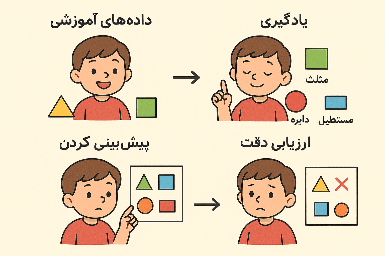 حال فرض کنید قصد داریم با دادن شکلهای مختلف و نمونههایی که تا به حال کودک ندیده است، او را امتحان کنیم که چقدر در عملیات یادگیری خود توانسته موفق باشد. به این خاطر نمونههایی جدید که تا کنون ندیده است (دادههای آزمایشی) به او میدهیم تا برای ما مشخص کند هر نمونه مربوط به کدام شکل هندسی است (ارزیابی دقت). اگر دقت تشخیص فرزند ما به حد نصاب مد نظر ما برسد که چه عالی در غیر اینصورت دوباره با فرزندمان کار خواهیم کرد.