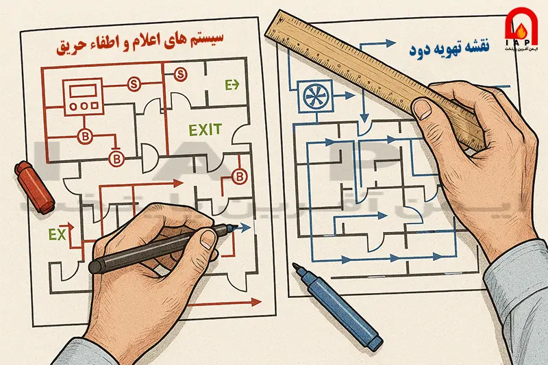 4. طراحی نقشه های اعلام و اطفا حریق و همچنین نقشه تهویه دود