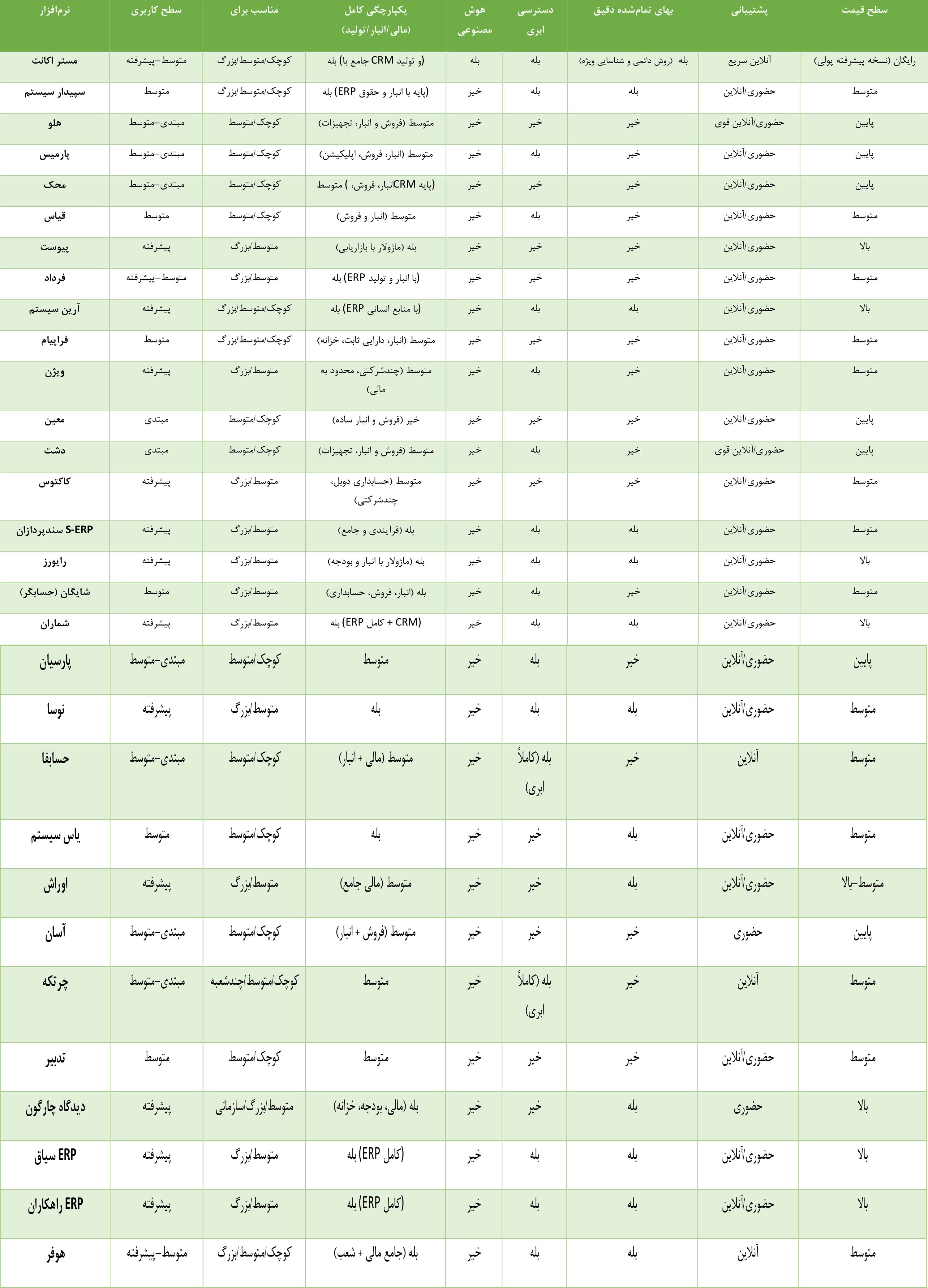 جدول مقایسه تحلیلی ۳۰ نرمافزار حسابداری ایران با مستر اکانت