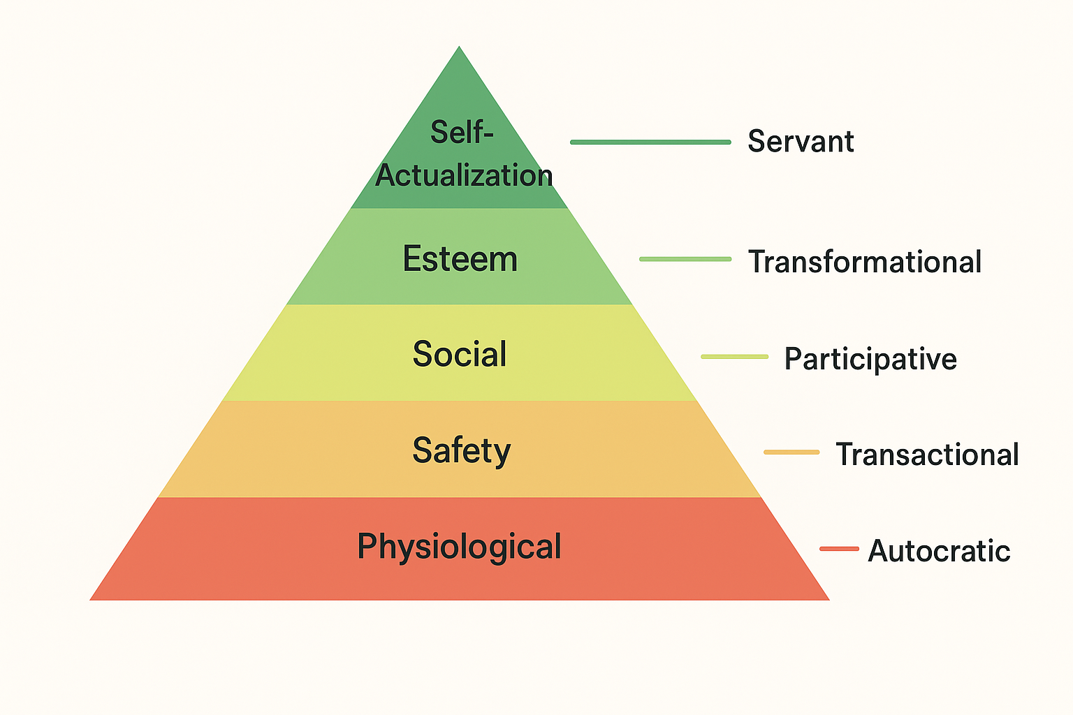 با تأمین این پایهها، نیازهای اجتماعی (تعلق، ارتباط، پذیرش) و نیاز به احترام و ارزشمندی اهمیت پیدا میکنند — این نیازها هستند که رضایت روانی، تعلق به سازمان، انگیزه درونی و همکاری را ممکن میسازند. سبکهای مدیریتی مشارکتی یا ترنسفورمیشنال در این زمینه مؤثرترند.