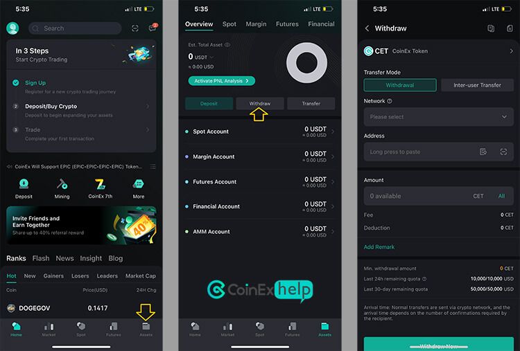 - اتریوم خریداریشده به حساب اسپات (Spot Account) شما اضافه میشود. برای انتقال به کیفپول شخصی، به بخش "Assets" بروید، "Withdraw" را انتخاب کنید و آدرس کیفپول مقصد را وارد کنید.