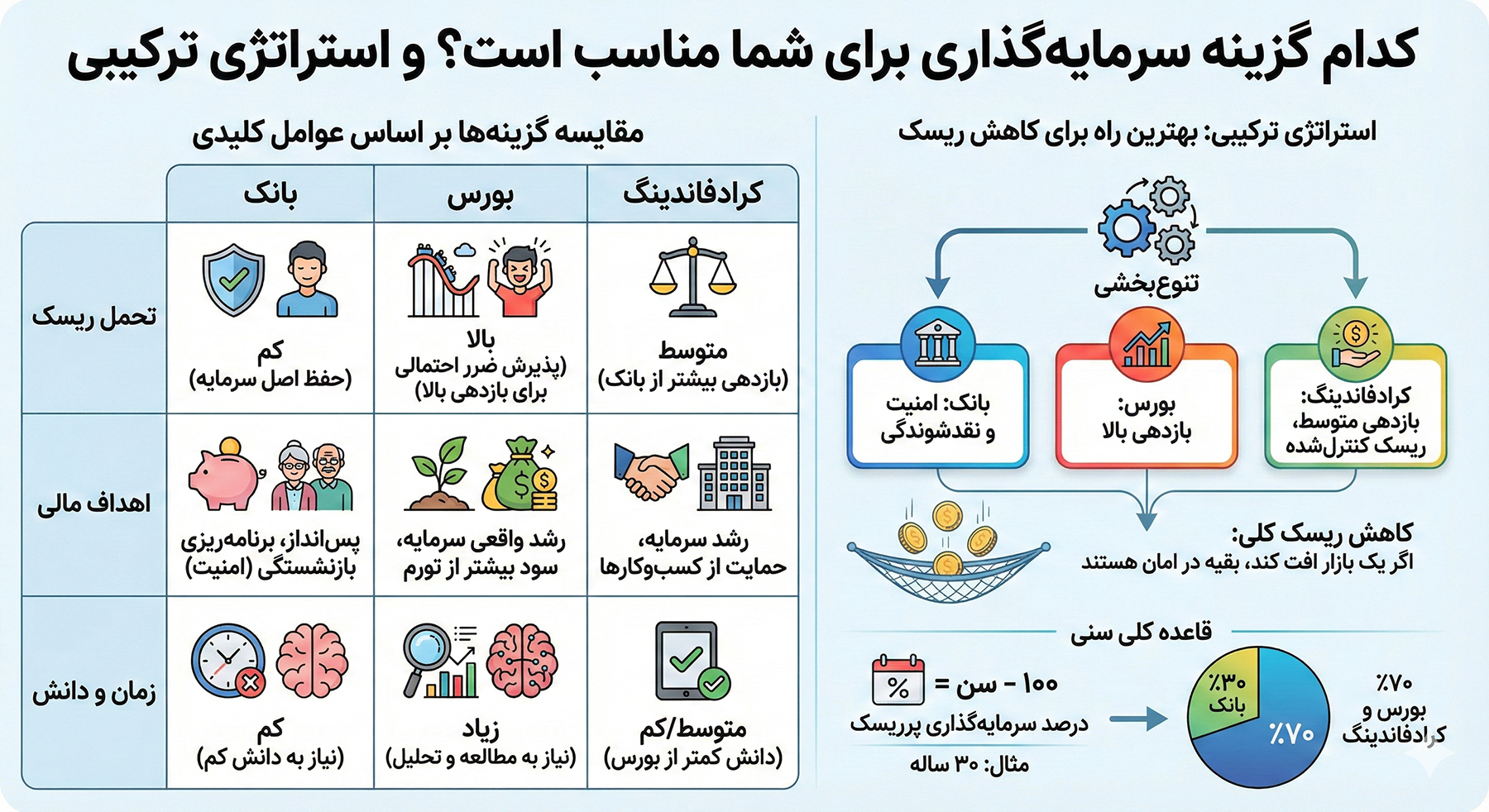 هر کدام از بانک، بورس و کرادفاندینگ مزایا و معایب خاص خود را دارند و هیچ گزینهای برای همه مناسب نیست. بانک امنترین اما کمبازدهترین گزینه است و برای افرادی که تحمل ریسک ندارند مناسب است. بورس بالاترین بازدهی را دارد اما با ریسک بالا همراه است و برای افرادی که دانش و تحمل ریسک دارند مناسب است. کرادفاندینگ در میانه قرار دارد با بازدهی متوسط و ریسک متوسط و برای افرادی که میخواهند بیشتر از بانک سود کنند اما ریسک بورس را نمیپذیرند، خوب است.