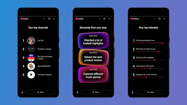 با Yearly Recap، یوتیوب عادتهای تماشای تو را در قالب یک مرور سالانه جذاب نشان میدهد؛ از پرتماشاترین ویدیوها تا موضوعاتی که بیشتر دوست داشتی.