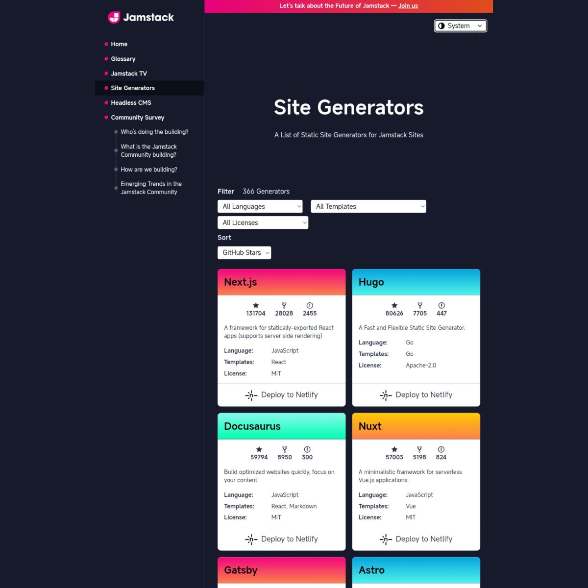 بر اساس سایت جم استک، حدود ۳۶۶ تولید کننده سایت موجود است که در لیست این وب سایت بر اساس تعداد ستاره های دریافتی در گیت هاب مرتب شده اند. اولین آنها نکست جی است، سپس هیوگو و در مرتبه چهارم فریم ورک ناکست مربوط به ویو.