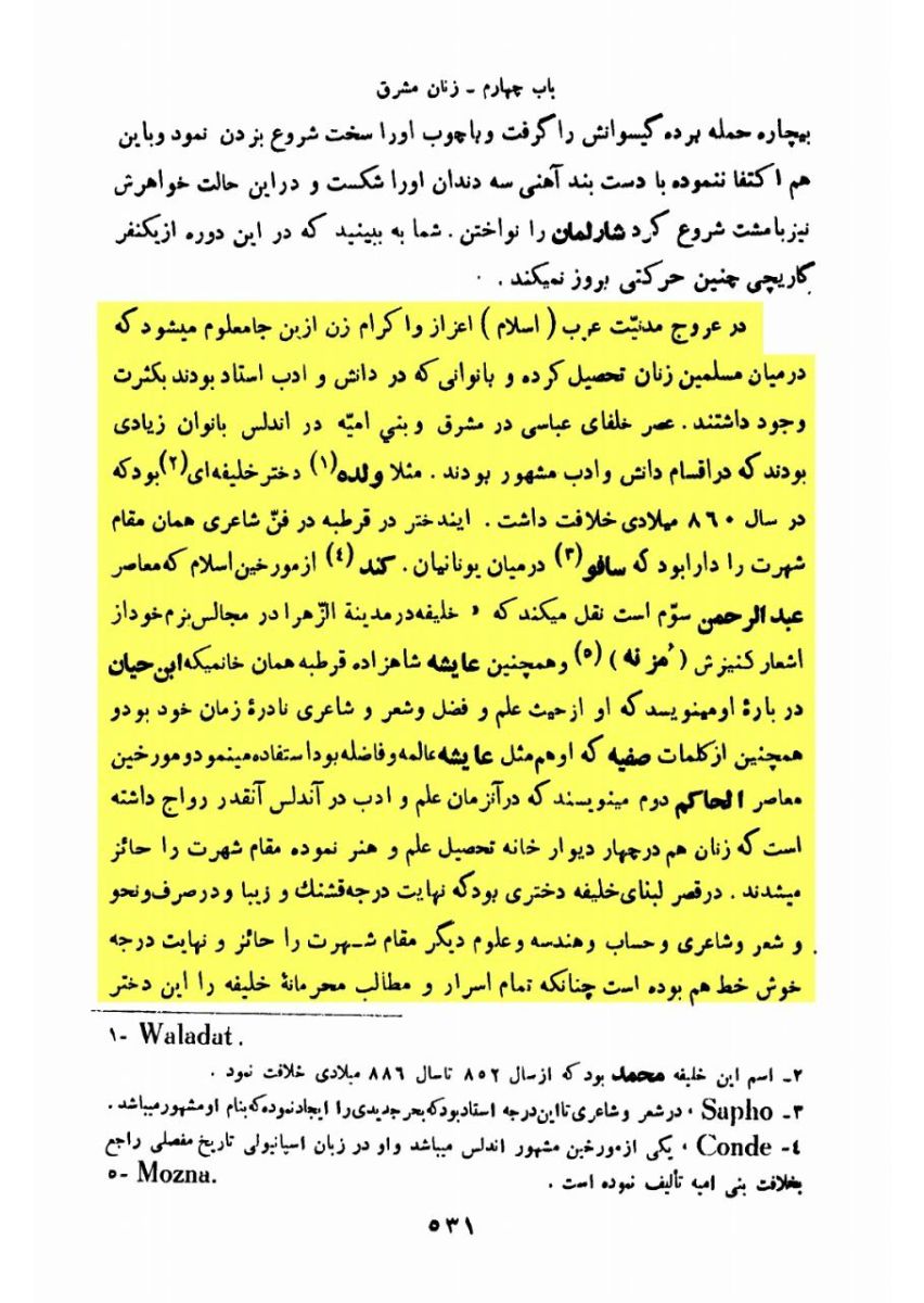 «در عروج مدنیّت عرب (اسلام) اعزاز و اکرام زن از اینجا معلوم می شود که در میان مسلمین زنان تحصیل کرده و بانوانی که در دانش و ادب استاد بودند به کثرت وجود داشتند.