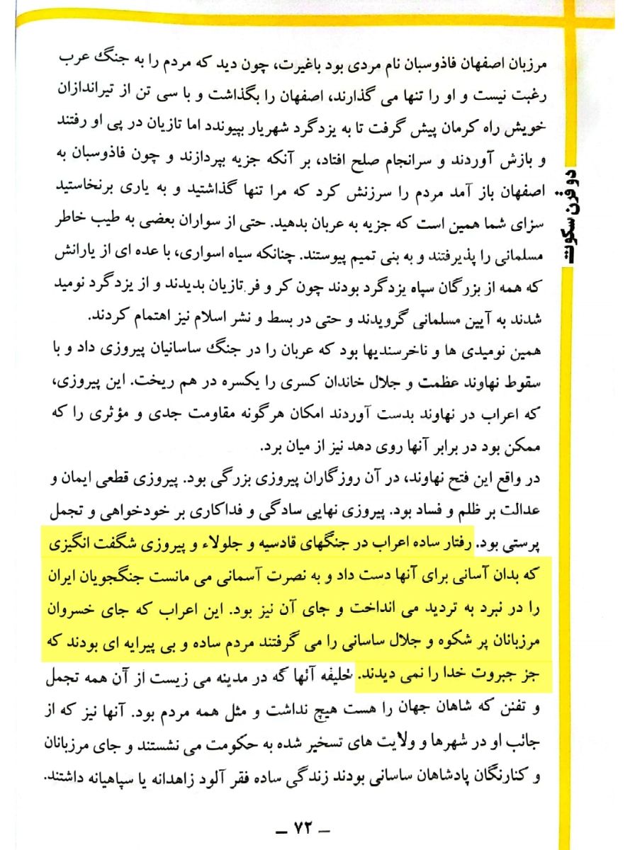 این اعراب که جای خسروان مرزبانان پر شکوه و جلال ساسانی را می گرفتند مردم ساده و بی پیرایه ای بودند که جز جبروت خدا را نمی دیدند.»۱۱