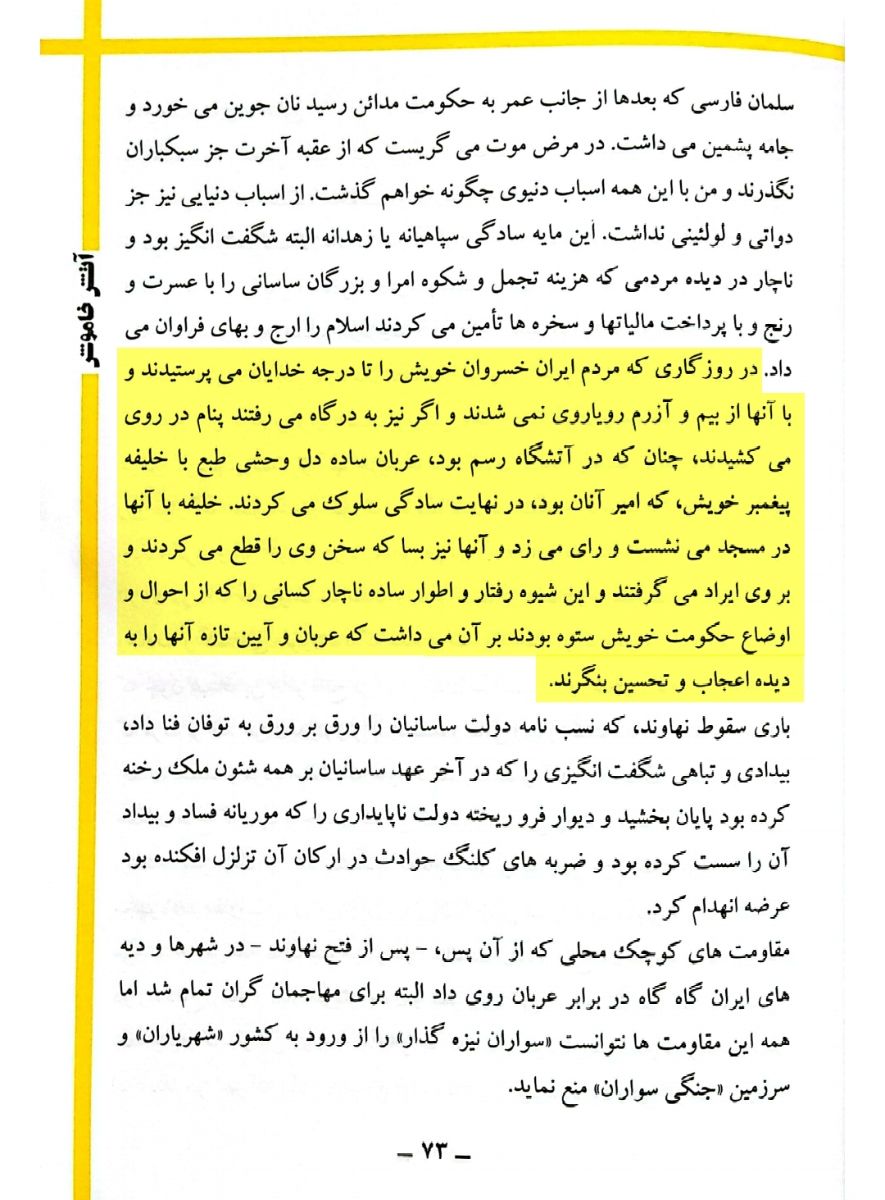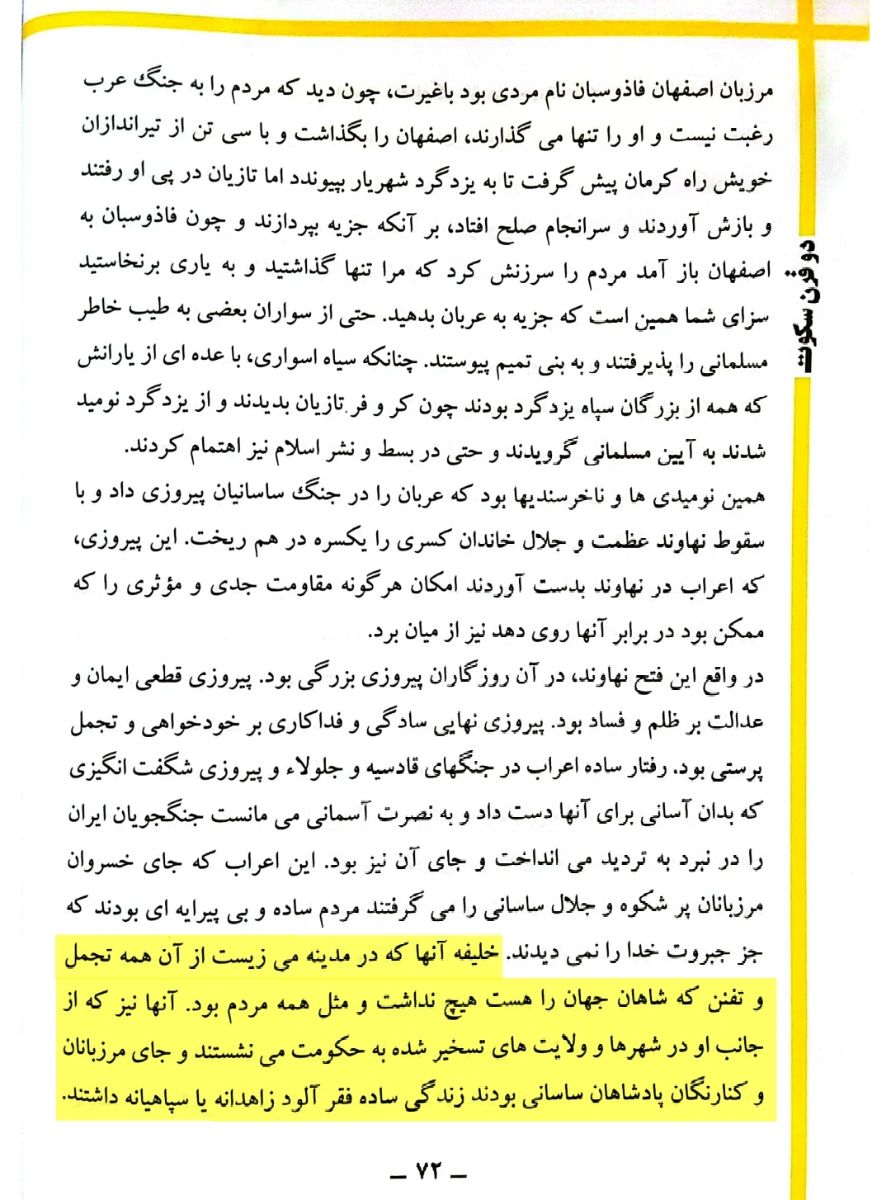 «در روزگاری که مردم ایران خسروان خویش را تا درجه خدایان می پرستیدند و با آنها از بیم و آزرم رویاروی نمی شدند و اگر نیز به درگاه می رفتند پنام در روی می کشیدند،چنانکه در آتشگاه رسم بود،عربان ساده دل وحشی طبع با خلیفه پیغمبر خویش،که امیر آنان بود،در نهایت سادگی سلوک می کردند.