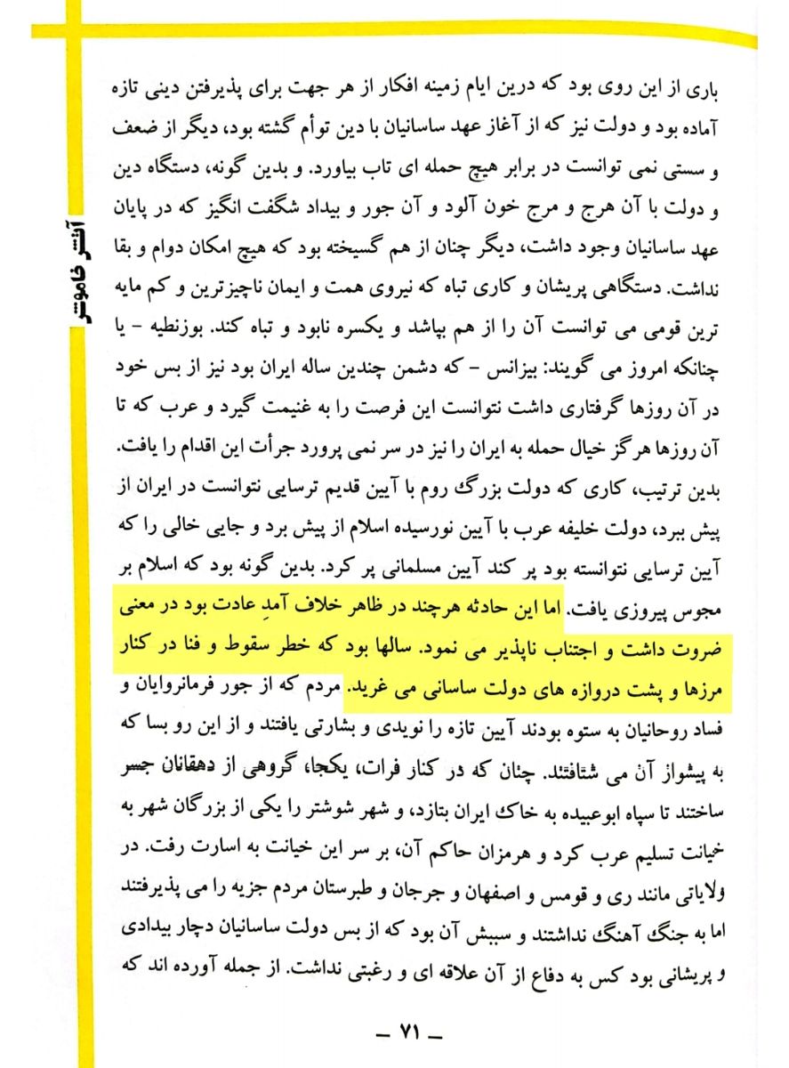 بدین ترتیب،کاری که دولت بزرگ روم با آیین قدیم ترسایی نتوانست در ایران از پیش ببرد،دولت خلیفه عرب با آیین نو رسیده اسلام از پیش برد و جایی خالی را که آیین ترسایی نتوانسته بود پر کند آیین مسلمانی پر کرد.بدین گونه بود که اسلام بر مجوس پیروزی یافت.»۶