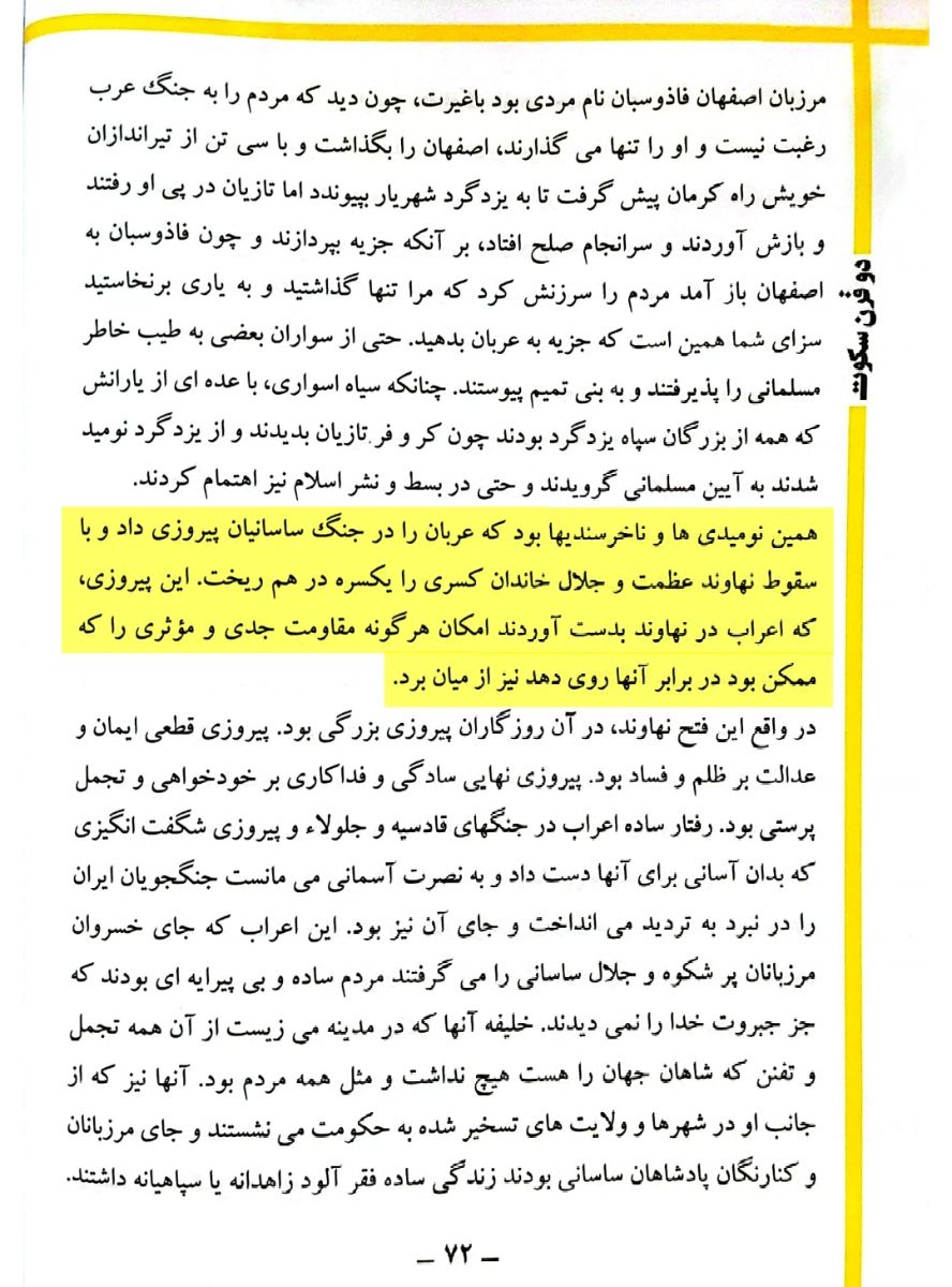 «همین نومیدی ها و ناخرسندیها بود که عربان را در جنگ ساسانیان پیروزی داد و با سقوط نهاوند عظمت و جلال خاندان کسری را یکسره در هم ریخت.این پیروزی،که اعراب در نهاوند بدست آوردند امکان هرگونه مقاومت جدی و مؤثری را که ممکن بود در برابر آنها روی دهد نیز از میان برد.»۹