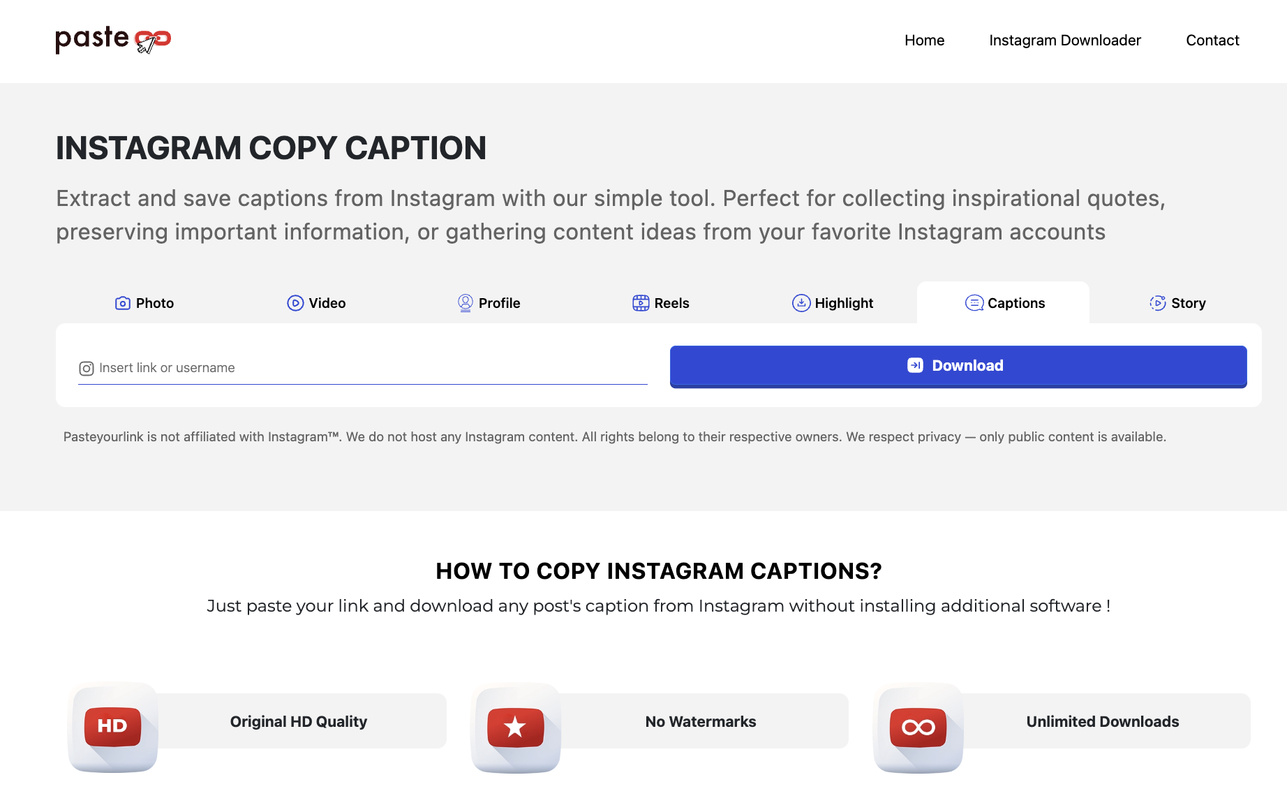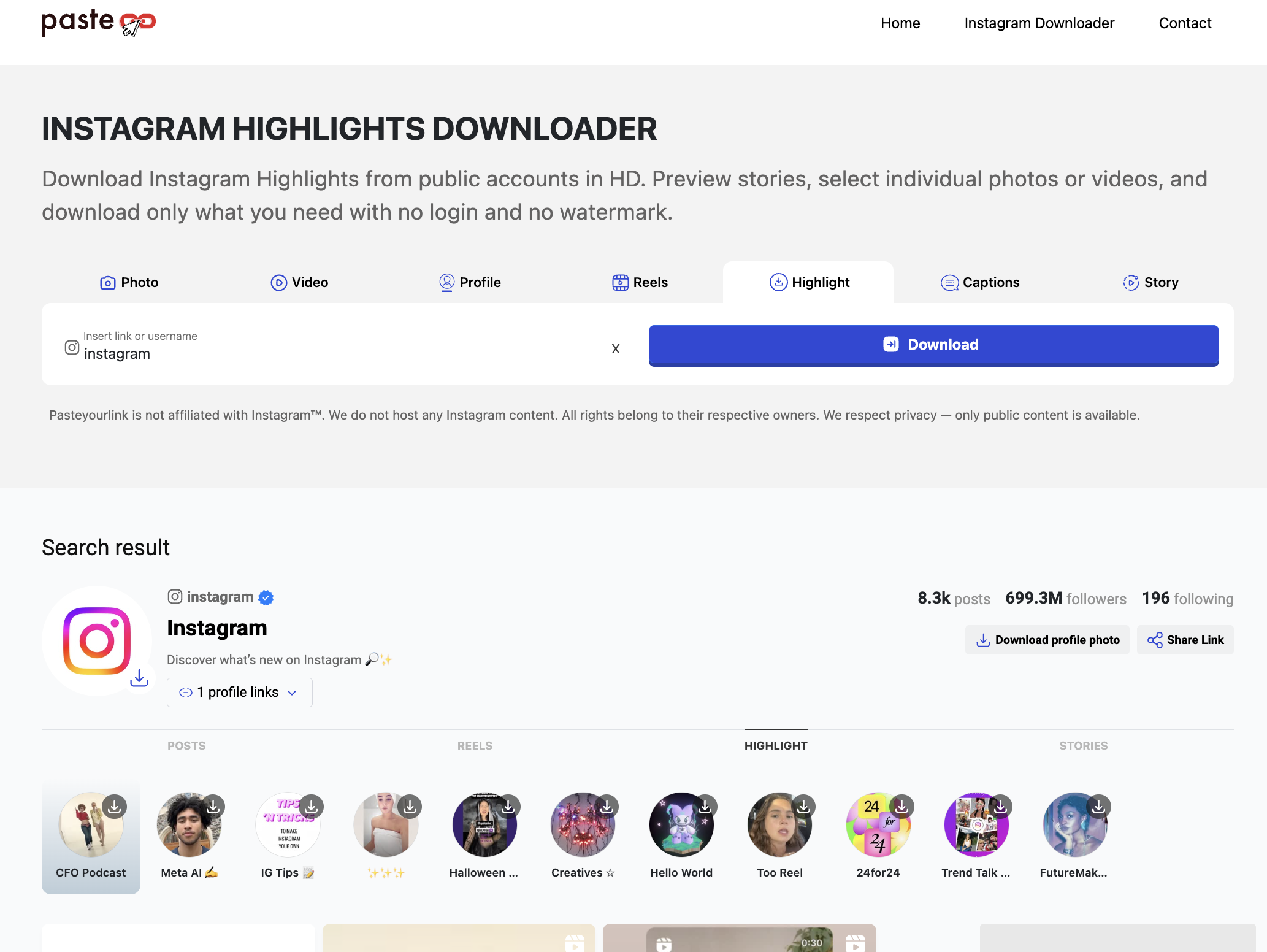 وارد سایت ابزار دانلود مورد نظرتان شوید (برای مثال PasteYourLink). لینکی که کپی کردهاید را در کادر ورودی Paste کنید. سپس روی دکمه دانلود یا جستجو کلیک کنید. ابزار شروع به پردازش لینک میکند و پس از چند ثانیه، محتوای هایلایت را نمایش میدهد.