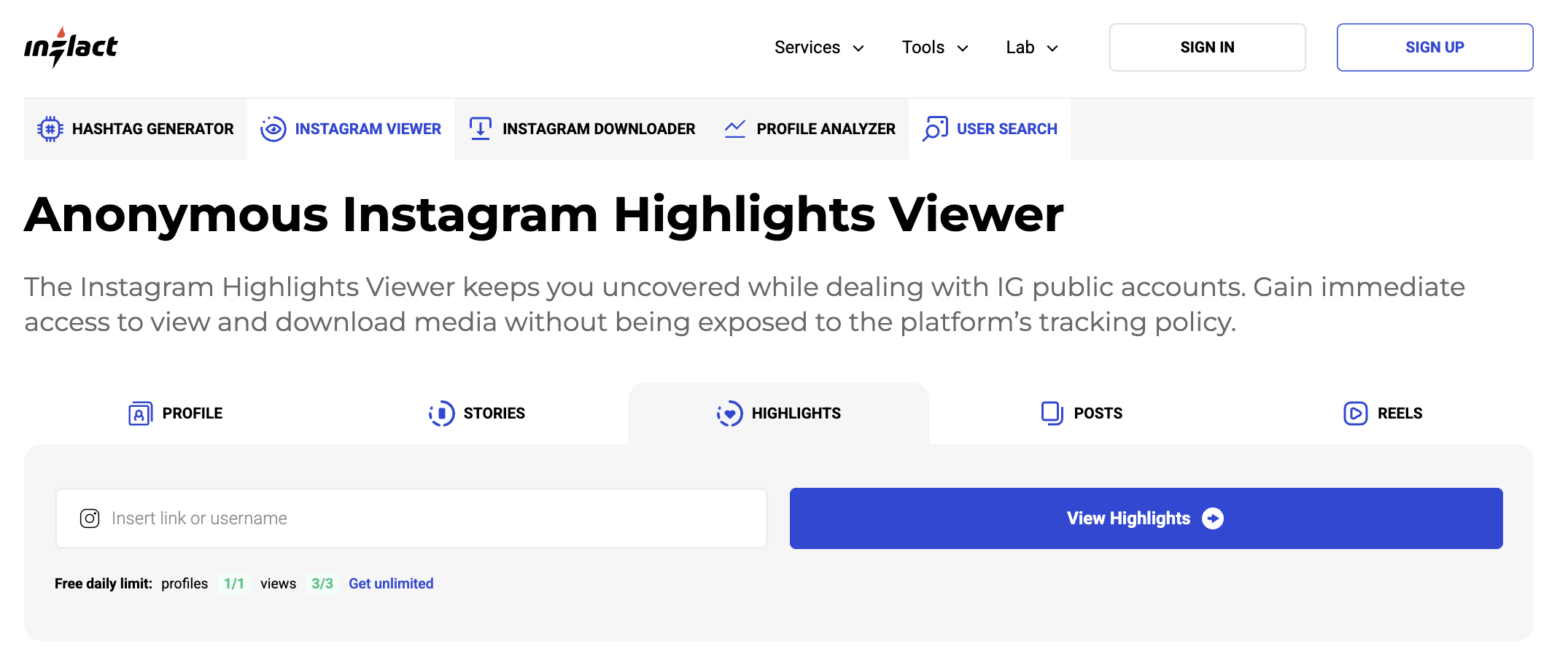 Inflact یکی از شناختهشدهترین ابزارهای دانلود محتوای اینستاگرام است که امکان دانلود بینام (Anonymous) هایلایتها را فراهم میکند. بدون نیاز به لاگین کار میکند و از حسابهای عمومی پشتیبانی میکند. کیفیت دانلود HD است و سرعت آن نسبتا بالاست. زبان فارسی ندارد و ممکن است از ایران نیاز به فیلترشکن داشته باشید.