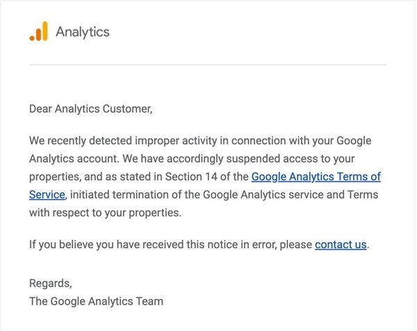 در زمستان ۱۴۰۳ گوگل در دو مرحله و با حذف اکانتهای گوگل آنالیتیکس، بیزینسهای ایرانی را غافلگیر کرد. در فاز اول و در هفته سوم دی، ابتدا کاربران آنالیتیکس یک ایمیل دریافت کردند که فعالیت نامناسب در اکانت آنها تشخیص داده شده و اکانت GA4 ساسپند شده است. برخی از اکانتها بلافاصله پس از دریافت این ایمیل حذف شدند درحالیکه برخی کاربران بعد از دریافت ایمیل تا چند روز کماکان به اکانت خود دسترسی داشتند و توانستند قبل از حذف کامل اکانت، از اطلاعات خود بکاپ بگیرند. بعد از چند روز این اکانتها نیز بسته شدند درشرایطیکه هیچ راهی برای بازگردانی اکانت یا دادههای جمعآوری شده وجود نداشت.