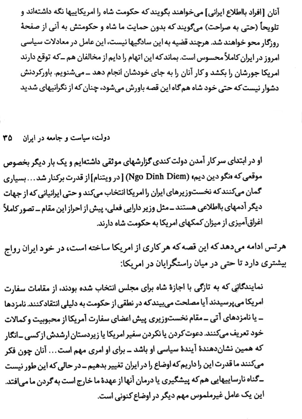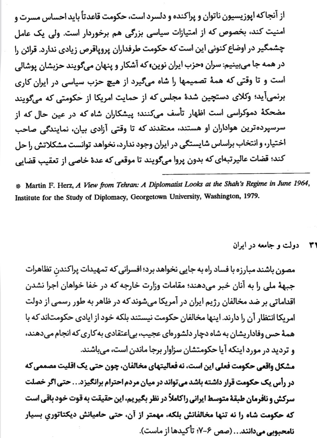 از آنجاكه اپوزیسیون ناتوان و پراکنده و دلسرد است، حكومت قاعدتاً بايد احساس مسرت و أمنيت كند، بخصوص كه از امتيازات سياسى بزرگی هم برخوردار است. ولى يك عامل چشمگیر در اوضاع كنونى اين است كه حكومت طرفداران پروپاقرص زيادى ندارد. قرائن را در همه جا میبينيم: سران حزب ايران نوين [این یکی از دو احزاب سیاسی فعال در آن دوران بود. امیرعباس هویدا، حسنعلی منصور و دکتر اقبال از اعضای این حزب بودند] كه آشكار و پنهان مىگویند حزبشان پوشالی است و تا وقتى كه همه تصميمها را شاه مىگیرد، از هيج حزب سياسى در ايران كارى برنمىآيد؛ وكلاى دستچین شده مجلس كه از حمايت امريكا از حكومتى كه مىگویند مضحكه دموكراسى است اظهار تأسف میکنند؛ پيشكاران شاه كه در عين حال كه از سرسپردهترین هواداران او هستند، معتقدند كه تا وقتى آزادى بيان، نمايندگی صاحب اختيار، و انتخاب براساس شايستگی در ايران وجود ندارد، نخواهد توانست مشكلاتش راحل كند؛ قضات عاليرتبهاى كه بدون پروا مىگویند تا موقعى كه عده خاصى از تعقيب قضايى مصون باشند مبارزه با فساد راه به جايى نخواهد برد؛ افسرانى كه تمهيدات پراكندن تظاهرات جبههملى را به آنان خبر مىدهند؛ مقامات وزارت خارجه كه در خفا خواهان اجرا نشدن اقداماتى بر ضد مخالفان رژیم ايران در آمريكا مىشوند که در ظاهر به طور رسمى از دولت امريكا انتظار آن را دارند. اينها مخالفان حكومت نيستند بلكه خود از ایادی حكومتاند که با همه حس وفاداريشان به شاه دچار دلشورههاب عجيب، بى اعتقادى به كارى كه انجام مىدهند، وترديد در مورد اينكه آيا حكومتشان سزاوار برجا ماندن است، مى باشند. مشكل واقعى حكومت فعلى اين است، نه فعاليتهاى مخالفان، چون حتى يك اقليت مصممى كه در رأس يك حكومت قرار داشته باشد میتواند در ميان مردم احترام برانگیزد...حتى اگر خصلت سركش و نافرمان طبقه متوسط ايرانى را کاملا در نظر بگیریم، اين حقيقت به قوت خود باقى است كه حكومت شاه را نه تنها مخالفانش بلكه، مهمتر از آن، حتى حاميانش ديكتاتوری بسيار نامحبوبى مىدانند.