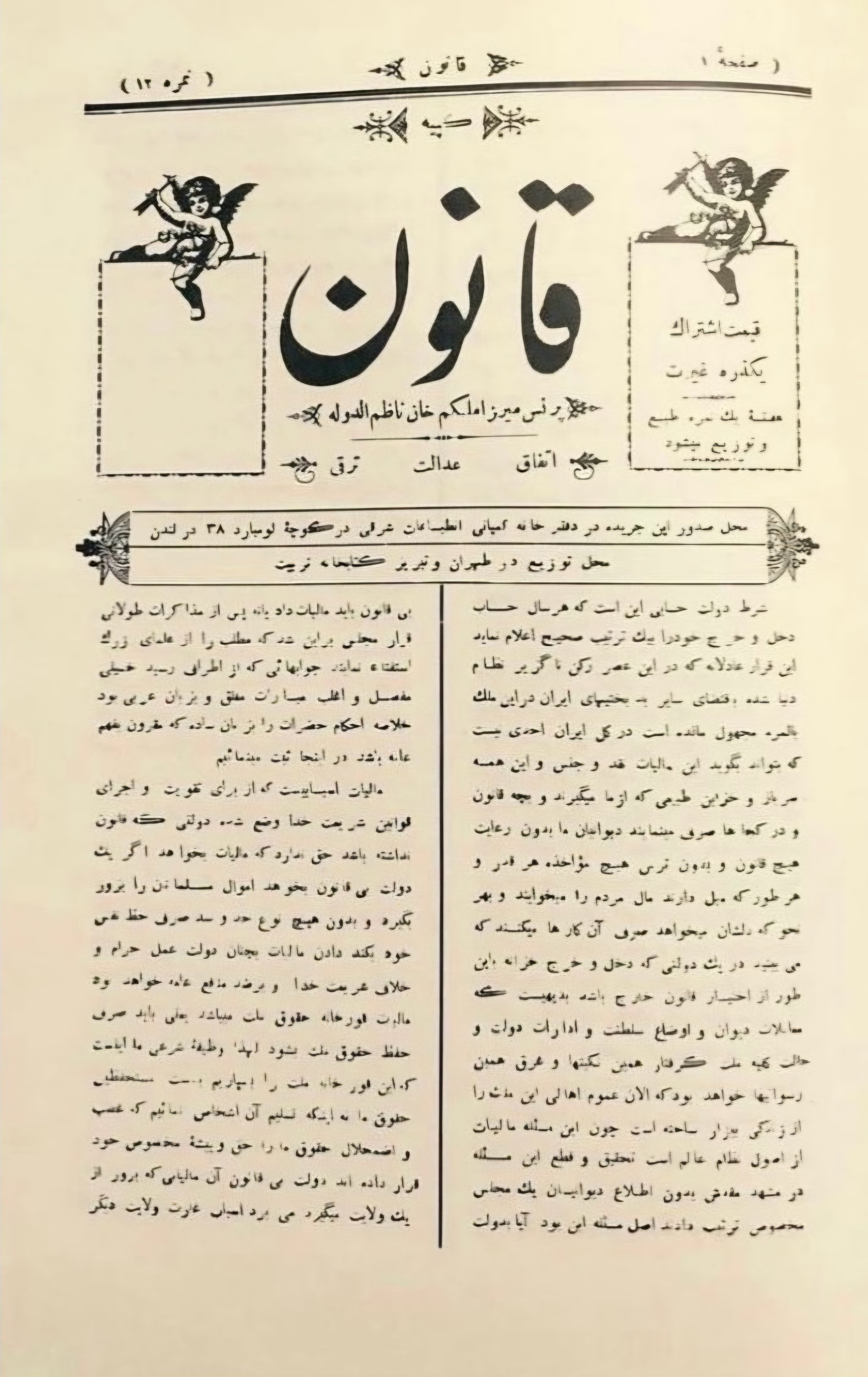 تاریخ دنیا به حیرت ثبت کرده است که در این چهل ساله سلطنت هنوز در ایران یک کلمه قانون وضع نشده است. در ملک انوشیروان با همه ترتیات دنیا و با همه کمالات دولت پرور وزرای ما، امروز اداره جمیع امور ایران عبارت است از دلبخواه روسا. در ملکی که هیچکس ماذون نباشد لفظ قانون و اسم حقوق به زبان بیاورد، در ملکی که مال و جان و ناموس و تمام زندگی خلق موقوف به بوالهوسی روسا باشد، در ملکی که هر جاهل نانجیب بتواند بر مسند وزارت، خود را مالک رتاب کل ملت قرار بدهد، در آن ملکت همت ملوکانه و عدالت ظل اللهی چه معنی خواهد داشت...در نظر ما مثل آفتاب روشن شده است که بدون قانون نه از برای سلاطین امنیت خواهد بود و نه از برای ملت آسایش...سال گذشته یعنی سنه ۱۸۸۹ عیسوی از خاک فرانسه موافق حسابهای گمرکها مبلغ هزار و سی دو کرور تومان امتعه به خارج حمل شده. و از قرار حساب گمرکهای داخله و خارجه از ممالک ایرانی سالی پانزده کرور تومان مال به خارج میرود. مملکت ایران خیلی وسیع تر. خاک ایران خیلی حاصل خیز. خلق ایران خیلی باهوش. خیلی کارکن. پس چرا از استعداد ملک و از هنرهای ذاتی خود به این درجه کمتر از دیگران منفعت میبرند. سببش این است که در سایر ممالک قانون مجرا است و در ایران هنوز لفظ قانون معمول نیست.