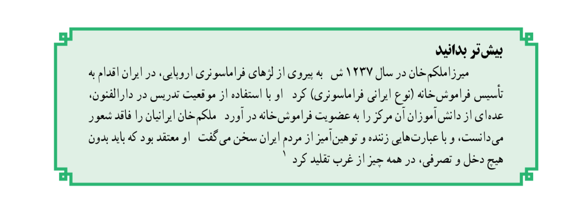 بهراستی اینهمه کینه و دشمنی برچه اساس بود؟ در بریدهای که دیدیم، فردید اساسا هیچ فکت و تحلیل تاریخی ارائه نکرد و تنها به فحاشی بسنده کرد. در نهایت هم منتقدانش را مقلدانی بیسوادانی ماسونزده و غربزده توصیف میکند. ملکم، چنانکه دیدیم، و بسیاری از دیگر مشروطهخواهان، نه غربزده بودند و نه اسلامگرا. البته که ملکم احتمالا در باطن عرفگرا بود اما بههدف ضددین نشان ندادن خود مدعی شد که قانون و مدنیت غربی همان چیزیست که در شریعت است. اشاره فردید به نقش فراماسونها درست است. در تاریخ، ملکمخان معروف است به تاسیس لژ فراموشخانه. اما امروز بر ما ثابت شده است که فراموشخانه هیچ ارتباطی به لژهای رسمی فراماسونری نداشت. در فراموشخانه بعضا حتی برخی از روحانیون پیشرو و شاهزادگانی چون جلالالدین میرزا حضور داشتند. بماند که همواره فراموشخانه مطالب هر جلسه را به گزارش ناصرالدین شاه میرساند. باید در نظر داشت که بخاطر تاثیرگذاریای که فراماسونها در انقلاب فرانسه داشتند، آن زمان فراماسونری برای بسیاری از روشنفکران نمادِ اصلاحطلبی و تجددخواهی بود. فراموشخانه نیز، بیشتر از آنکه محفلی مخوف و وابسته به یهود باشد، مجمعی بود برای جمع شدن و تبادل نظر. اما از آنجا که همانطور پیشتر گفتم، طرح مستقیم مباحث غربی در اجتماع با موانع بسیار روبرو بود، ملکم ترجیح داده بود آن را در فضای عمومی صریحا طرح نکند.