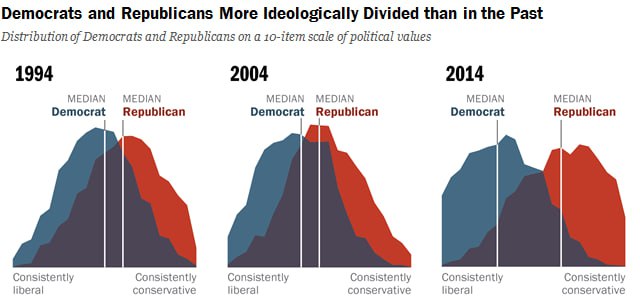 در سال ۱۹۹۴، توزیع دو حزب هنوز همپوشانی زیادی دارد. یعنی بیشتر دموکراتها و جمهوریخواهان در محدودهٔ «میانه» قرار دارند ولی در گذر زمان این همپوشانی کمتر شده؛ یعنی طرفداران این دو حزب دیگر خیلی کمتر از قبل تحمل شنیدن حرف های یکدیگر را دارند و این تحقیقات دلیل این پدیده را همین قابلیت شخصیسازی محتوا در شبکه های اجتماعی میداند.