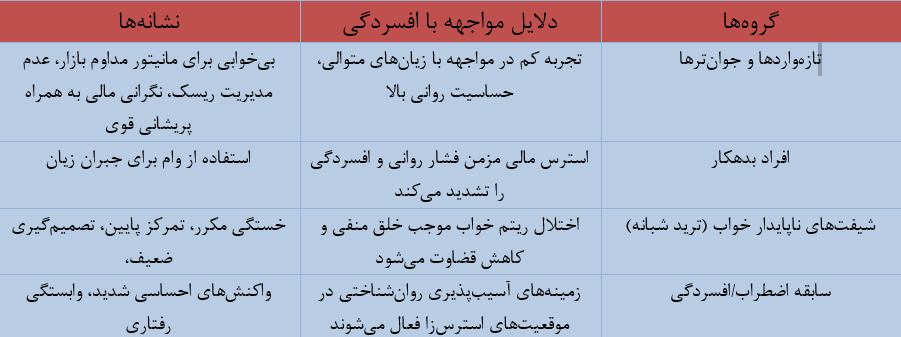 تقریبا همه تریدرها در معرض فشار روانی هستند، اما شدت ریسک برای همه یکسان نیست. در واقع شواهد نشان میدهد که گروههایی با ویژگیهای خاص (از تازهواردهای پرهیجان تا معاملهگران شبزندهدار بازارهای ۲۴/۷) بهدلیل ترکیب عوامل شناختی، زیستی و اقتصادی، شانس بیشتری برای تجربه پریشانی روانی و «افسردگی مالی» دارند. در جدول زیر میتوانید بهخوبی مشاهده کنید که کدام دسته از تریدرها بیشتر در معرض خطر افسردگی قرار دارند: