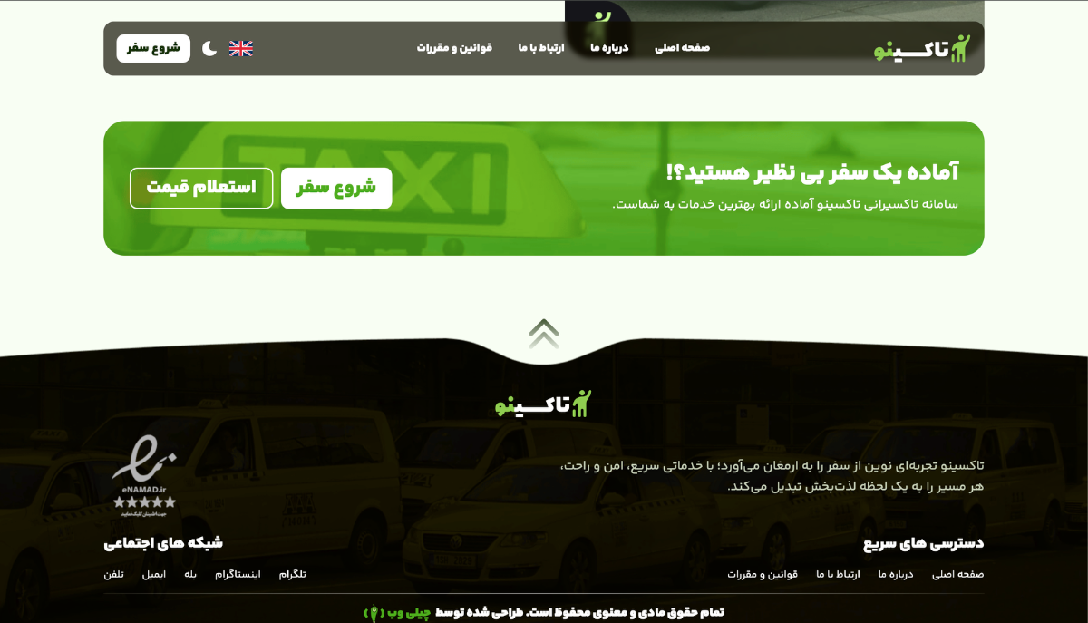 یکی از مهمترین ویژگیهای تاکسینو، طراحی مینیمالیستی و کاربرپسند آن است. چینش عناصر در صفحه به گونهای انجام شده که کاربر بدون نیاز به جستوجوی زیاد، بتواند به گزینههای مورد نظر خود دسترسی داشته باشد. دکمههای واضح، کنتراست مناسب رنگها و فونتهای خوانا، از نقاط قوت این طراحی محسوب میشوند.