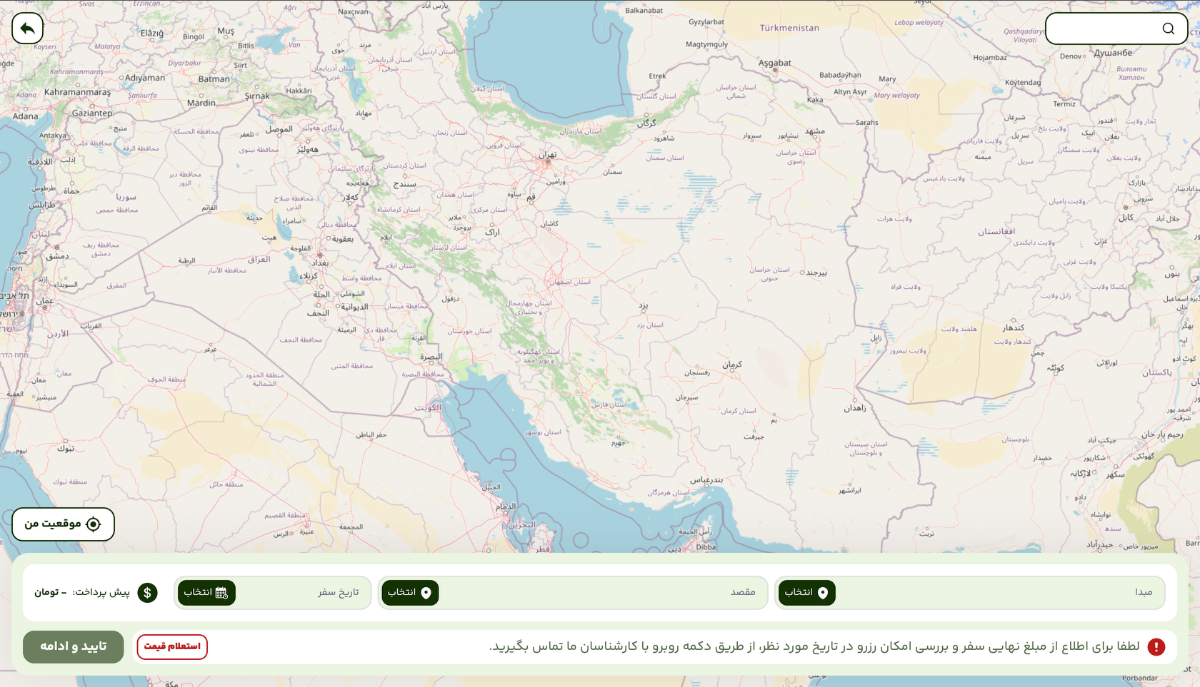 - ورود اطلاعات مبدا و مقصد: کاربر با چند کلیک ساده میتواند موقعیت مکانی خود را مشخص کرده و مقصد را تعیین کند.