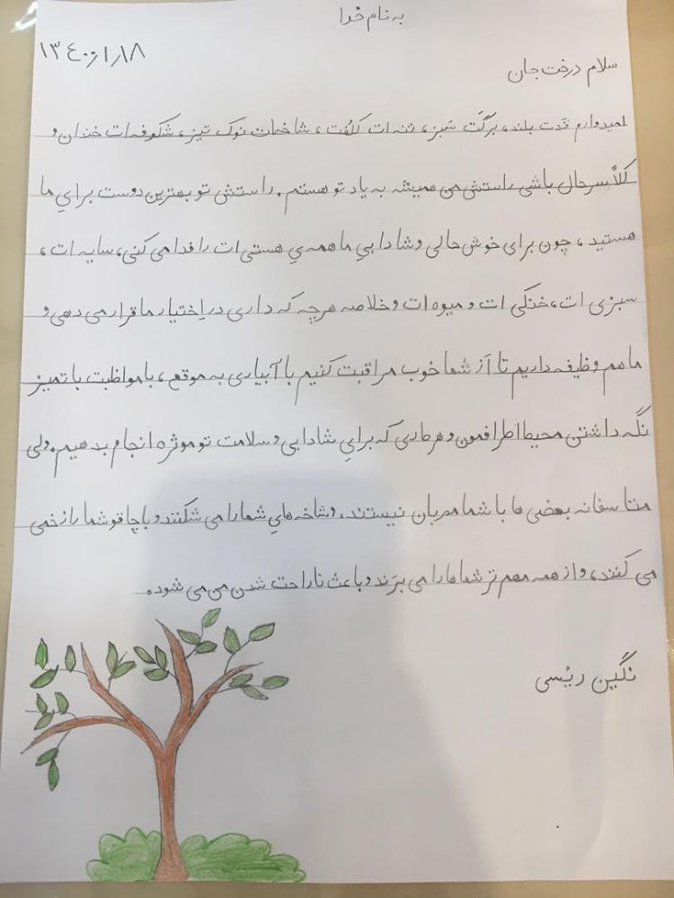 امیدوارم قّدت بلند، برگَت سَبز، تنه ات کلُفت، شاخه ات نوک تیز، شکوفه ات خندان و کلاً سرحال باشی. راستش من همیشه به یاد تو هستم. راستش تو بهترین دوست برایِ ما هستید، چون برای خوش حالی و شادابیِ ما همه یِ هستی ات را فدا می کنی، سایه ات، سبزی ات، خنکی ات و میوه ات و خلاصه هر چه که داری در اختیار ما قرار می دهی و ما هم وظیفه داریم تا از شما خوب مراقبت کنیم با آبیاری به موقع، با مواظبت با تمیز نگه داشتن محیط اطرافمون و هر کاری که برایِ شادابی و سلامت تو موثره انجام دهیم. ولی متاسفانه بعضی ها با شما مهربان نیستند. و شاخه هایِ شما را می شکنند و با چاقو شما را زخمی می کنند، و از همه مهم تر شما را می برَند و باعث ناراحت شدن من می شود.