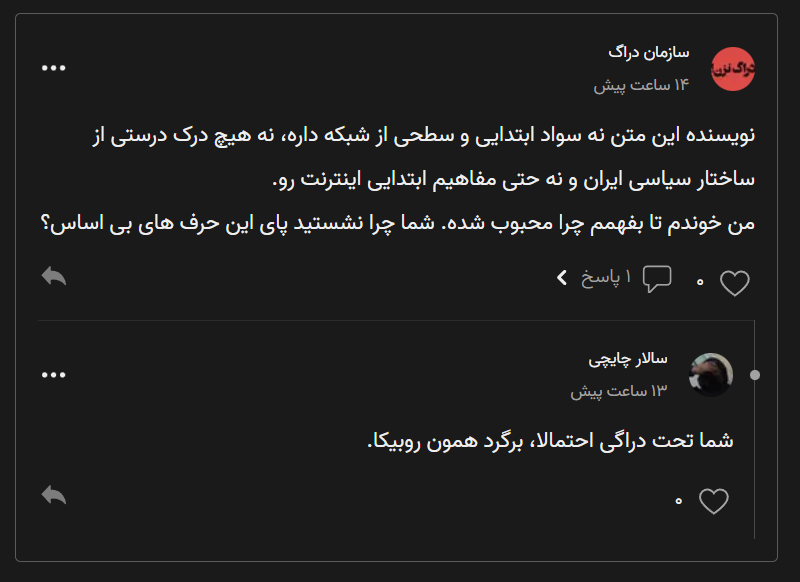 یه دوست روبیکایی هم اومد گفت که من کوچکترین سررشتهای از شبکه و ساختار سیاسی ندارم. سایبریهای بینام و نشون و بدون دنبالکننده و بدون پست که فقط برای چریدن و پاشیدن خزعبلات توی اینترنت حضور دارن. من مهندس کامپیوتر هستم و سالهاست درباره ساختار سیاسی و فرهنگی ایران مطالعه دارم. دیگه به هر ننه قمری که از راه میرسه نباید رزومه نشون بدم که: