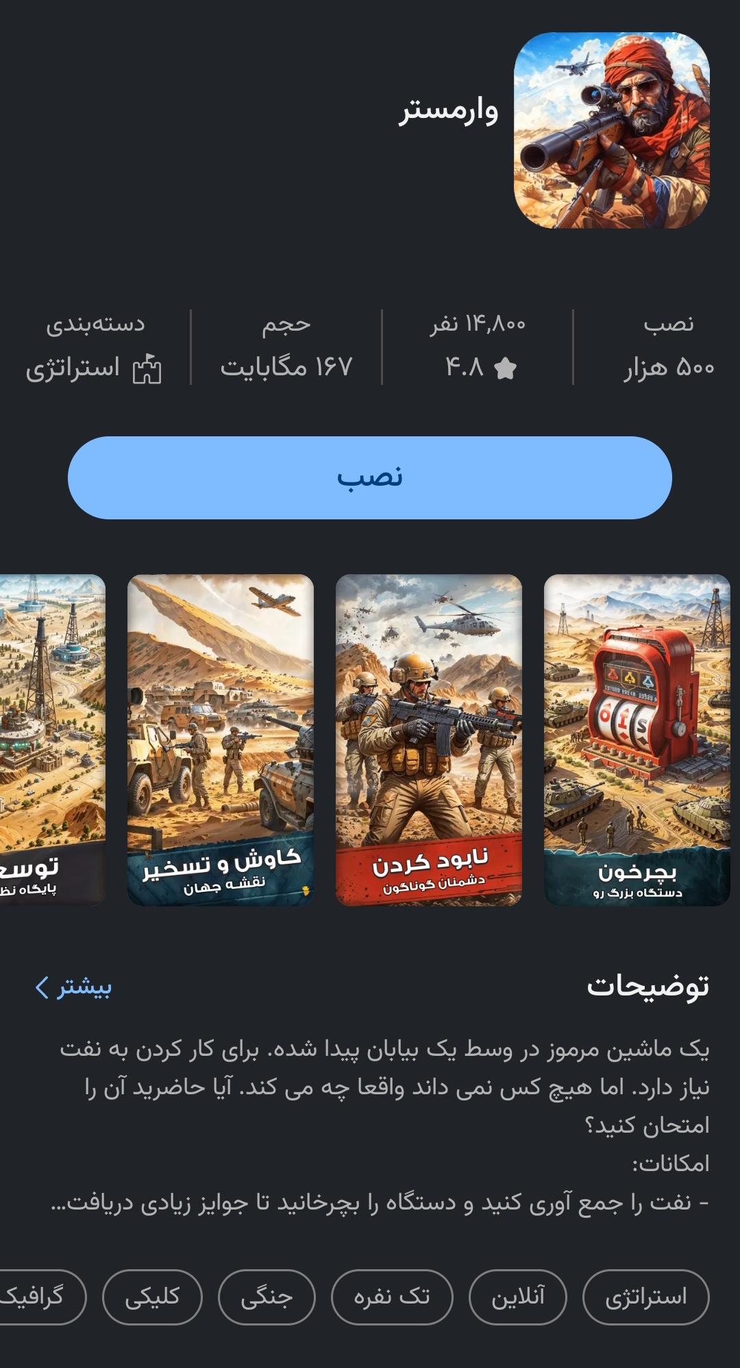 در عکس بالا بازی های دیگر رو هم مثل تاراج میبینید که جیازگین کلش رویال هستند. بازی نامداران رو هم نصب کنید. هنگام نصب برای کودکان حتما مراقب خشونت موجود در بازی باشید و از آنها بخواهید که چنین بازی های را نصب نکنند. بازی هایی مثل بزن بهادر دارای صحنه های پرتاب چاقو و ... هستند.