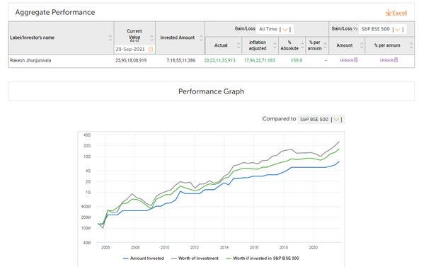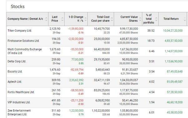 به سودهایی که او از شرکتهایی مانند تیتان , FSL , اسکورتس بدست آورده نگاه کنید بیشتر از 38 درصد از سبد سهام او از شر کت تیتان است و اکنون نیز بخش بزرگی از سهام این شرکت را در اختیار دارد راکش هر سهم این شرکت را فقط 22 روپیه خرید و سرمایه گذاری او اکنون 2125 کرور ارزش دارد اولین منبع خرید سهام او از این شرکت فقط 10 روپیه بود و امروز هر سهم آن 194 روپیه معامله می شود.راکش به سادگی سهامی را نمی خرد تا در یک بازه زمانی کوتاه بفروشد او سهام ها را برای زمان طولانی نگه می دارد و اینگونه است که سبد های سهام بزرگ ایجاد می شود
