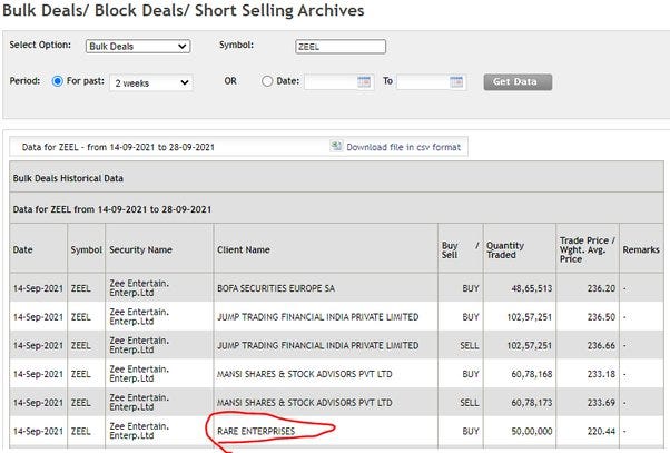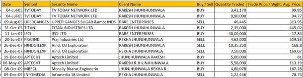 این مورد من را کنجکاو کرد و می خواستم بدونم اگر استراتژی سرمایه گذاری راکش جونجوالا را دنبال کنم چه اتفاقی می افتد؟ تنها کاری که باید انجام دهیم این است که گزارشات معاملات انبوه و بررسی این مورد که او کجا سرمایه گذاری می کند است و بعد از آن فقط سهام را بخرید بخش اعظم ثروت راکش جونجوالا از نگهداری طولانی مدت سبد سهام خودش بدست آمده است راکش به سادگی معامله نمی کند.جمله معروف وارن بافت را همیشه به یاد داشته باشید ما علاقمندیم سهام موفق برای همیشه نگه داریم. اگر بتوانیم به سادگی از انتخاب سهام های راکش جونجوالا پیروی کنیم احتمالا سود عالی کسب می کنیم اما نمی توانیم به سادگی سابقه خرید سهام ZEE او را دنبال کنیم چون به داده های بیشتری نیاز داریم تا بفهمیم که آیا او واقعا در روند معاملات طولانی مدت درآمد کسب کرده است یا نه ؟ من به وبسایت بورس بمبئی رفتم و همه گزارشات معاملات انبوه را از سال 2005 تا به امروز دانلود کردم این اطلاعات مربوط به شانزده سال است و به دنبال نام مشتریانی از جمله راکش جونجوالا و رخا جونجوالا و شرکت rare enterprises بودم راکش جونجوالا سهام های خود را به نام همسرش یا شرکتش می خرد (RARE از ترکیب دو حرف اول نام خودش و همسرش تشکیل شده است)