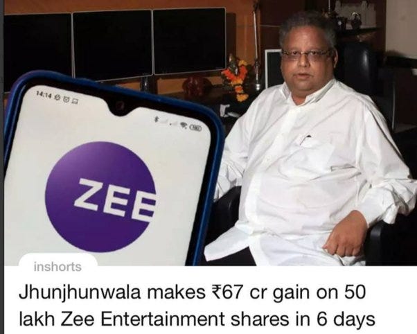 همه می دانیم که راکش جونجوالا با خرید سهام کمپانی ZEE تنها در شش روز 67 کرور سود بدست آورد اگر چه عده ای معتقدند این یک معامله داخلی بوده وممکن است او از قبل اخبار ادغام کمپانی های سونی و ZEE مطلع بوده و قبل از انتشار اخبار آن سهام را خریداری کرده است