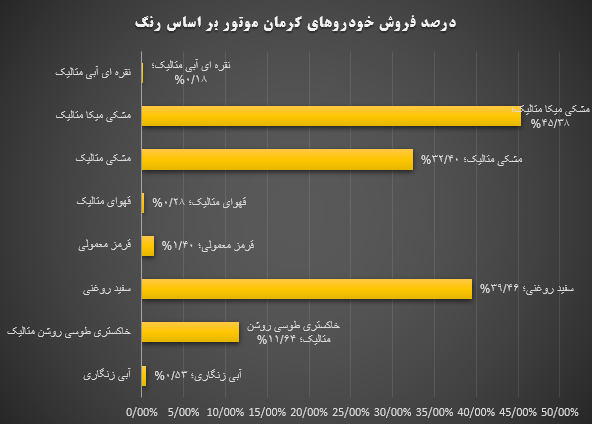 طی گزارشات دریافتی از واحد فروش کرمان موتور بیشترین درصد فروش خودروهای کرمان موتور هم از سال 1400 اول به رنگ مشکی میکا متالیک، دوم رنگ سفید روغنی، سوم رنگ مشکی متالیک و چهارم به رنگ خاکستری طوسی روشن متالیک تعلق دارد و این اعداد، مهر تاییدی بر اطلاعات مذکور میزند.