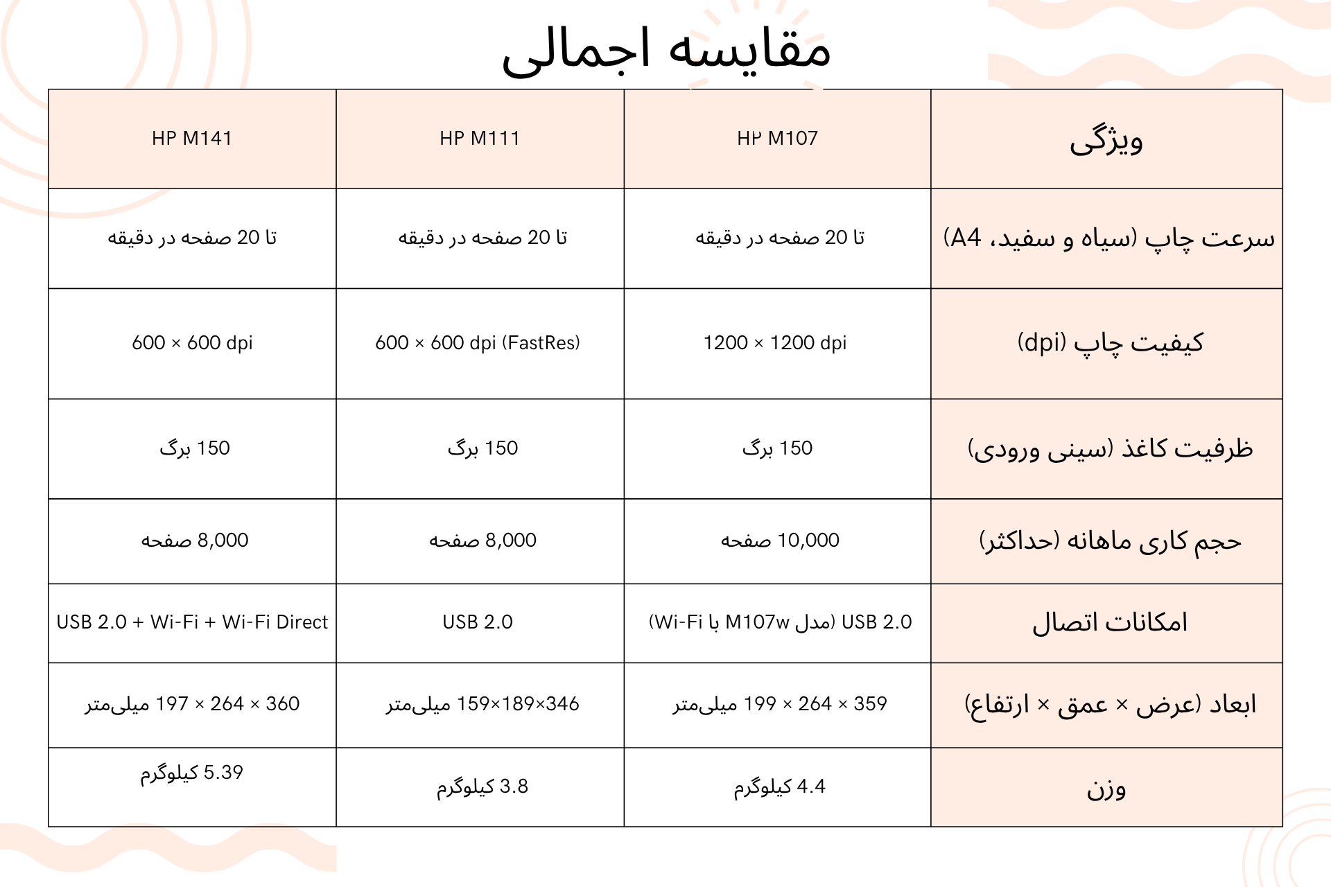 برای اینکه انتخاب میان سه پرینتر HP سری M شامل مدلهای M107، M111 و M141 برای شما آسانتر شود، در ادامه جدولی آماده کردهایم که تفاوتهای کلیدی آنها از جمله سرعت چاپ، نوع اتصال، قابلیتهای چندکاره، کیفیت خروجی و حجم کاری را بهصورت دقیق مقایسه میکند. با بررسی این جدول، میتوانید بهراحتی تشخیص دهید کدام مدل متناسب با نیاز شما ، چه برای خانه و چه برای دفتر کار، بهترین گزینه است.