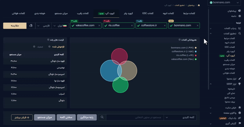 فقط با وارد کردن آدرس یک رقیب، توی ۲ دقیقه ۵۸۹ کلمه استفادهنشده و ۵۸۹ کلمه فراموششده به دست میارین. اگه سه رقیب اضافه کنین، ایدهها چند برابر میشن.