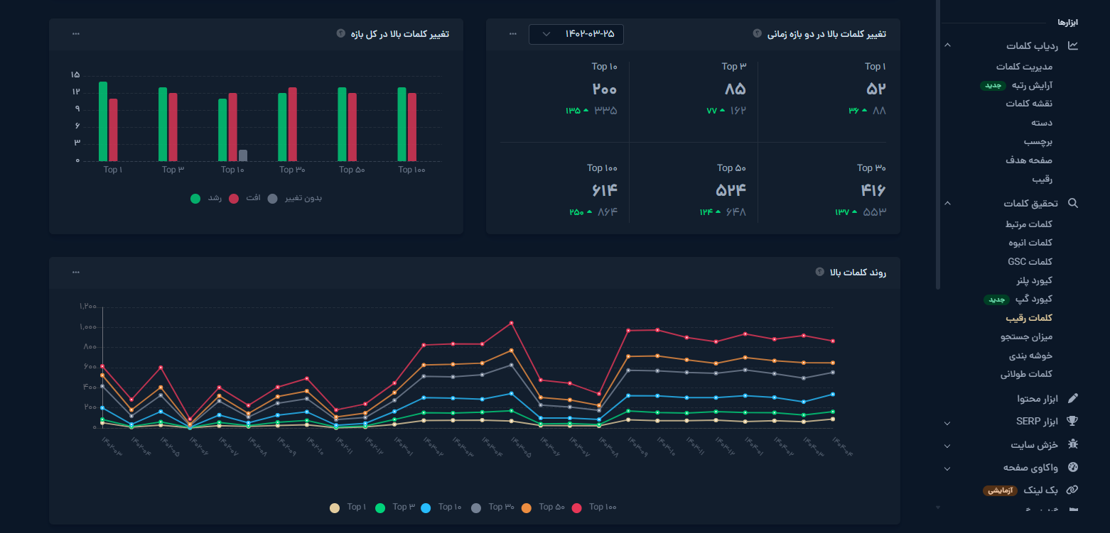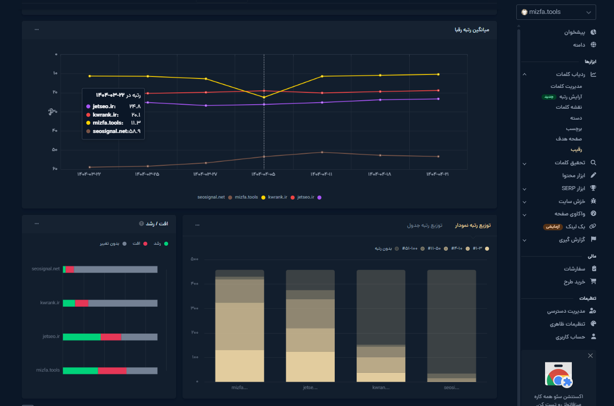 دادههای نموداری و جدولی رو ببینید؛ نمودار افت/رشد رتبهی رقبا و نمودار توزیع رتبه بهتون کمک میکنه تغییرات رو بصری دنبال کنید.