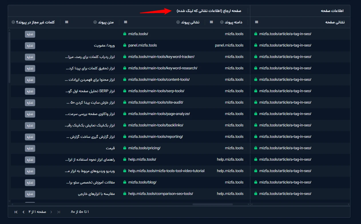 در جدول نتایج، ستونهای مربوط «صفحه ارجاع» بهت نشون میده از چه صفحات داخلی به اون مقاله لینک داده شده.