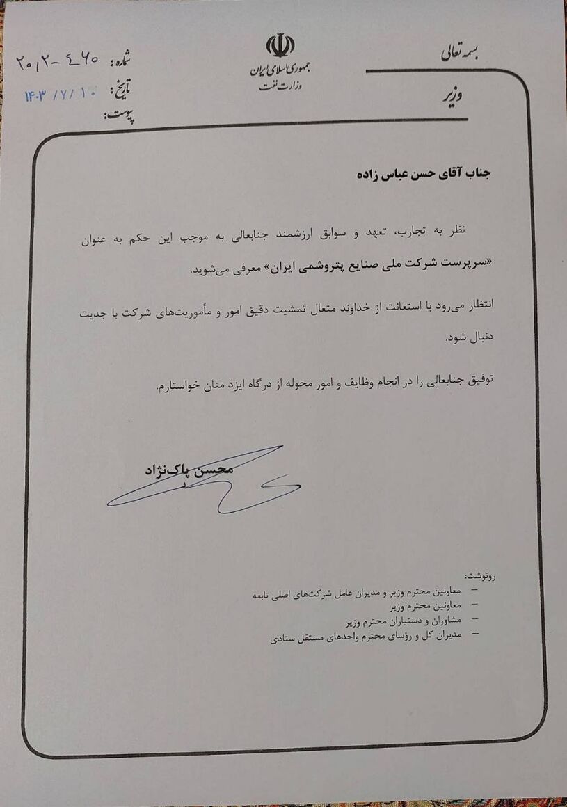 وزیر نفت طی حکمی «حسن عباسزاده» را بهعنوان سرپرست شرکت ملی صنایع پتروشیمی منصوب کرد.