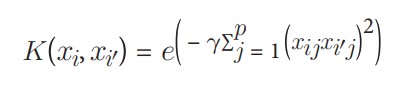 که در آن d درجه تابع کرنل پلینومیال است. به طور جایگزین، میتوانیم از یکی از رایجترین کرنلها در ماشینهای بردار پشتیبان، یعنی کرنل تابع پایه شعاعی (RBF)، استفاده کنیم: