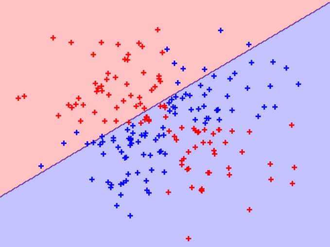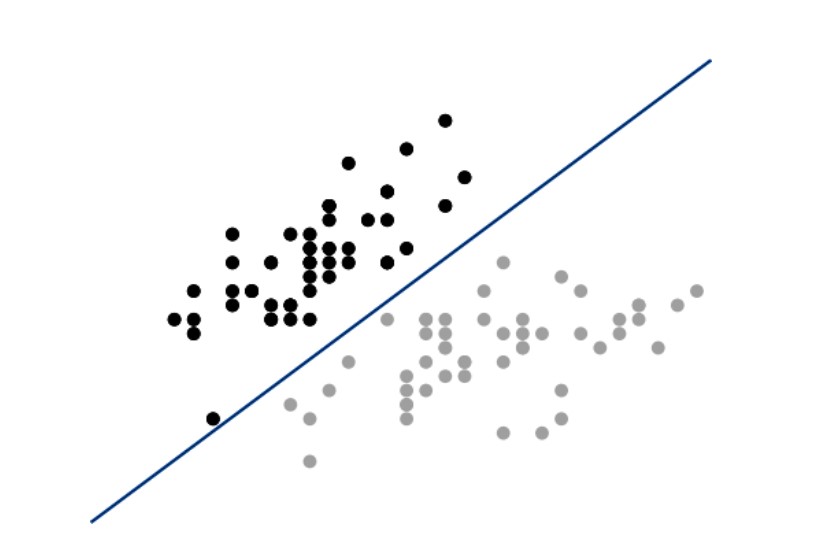 در این نمایش بصری، تمام مشاهدات کلاس ۰ به رنگ سیاه و مشاهدات کلاس ۱ به رنگ خاکستری روشن هستند. ابرصفحه، مرز تصمیمگیری است که مشخص میکند مشاهدات جدید چگونه طبقهبندی میشوند. به طور خاص، هر مشاهدهای که بالای خط باشد به عنوان کلاس ۰ و هر مشاهدهای که زیر خط باشد به عنوان کلاس ۱ طبقهبندی میشود. میتوانیم این را با ایجاد یک مشاهده جدید در گوشه بالا-چپ نمایش بصریمان آزمایش کنیم، که باید به عنوان کلاس ۰ پیشبینی شود: