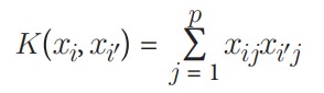 که در آن β0 بایاس است، Ѕ مجموعه تمام مشاهدات بردار پشتیبان، α پارامترهای مدل هستند که باید آموخته شوند، xi و ´xi جفتهایی از دو مشاهده بردار پشتیبان هستند. مهمتر از همه، K یک تابع کرنل است که شباهت بین xi و ´xi را مقایسه میکند. اگر توابع کرنل را درک نمیکنید، نگران نباشید. برای اهداف ما، فقط کافی است بدانید که (1) K نوع ابرصفحهای که برای جداسازی کلاسهای ما استفاده میشود را تعیین میکند، و (2) ما با استفاده از کرنلهای مختلف، ابرصفحههای متفاوتی ایجاد میکنیم. برای مثال، اگر بخواهیم یک ابرصفحه خطی ساده مانند آنچه در دستورالعمل 17.1 ایجاد کردیم داشته باشیم، میتوانیم از کرنل خطی استفاده کنیم: