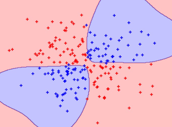 با استفاده از کرنل تابع پایه شعاعی، میتوانیم یک مرز تصمیمگیری ایجاد کنیم که در مقایسه با کرنل خطی، کار بسیار بهتری در جداسازی دو کلاس انجام میدهد. این انگیزه اصلی استفاده از کرنلها در ماشینهای بردار پشتیبان است.