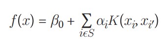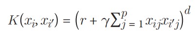 که در آن p تعداد ویژگیهاست. اما اگر بخواهیم یک مرز تصمیمگیری غیرخطی داشته باشیم، کرنل خطی را با یک کرنل پلینومیال جایگزین میکنیم:
