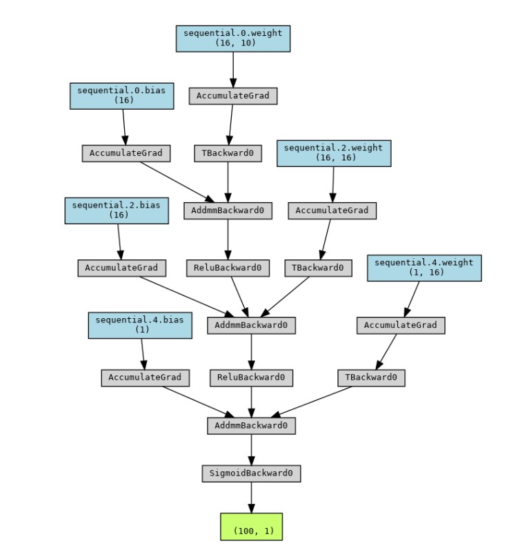 کتابخانه torchviz توابع کاربردی سادهای را ارائه میدهد تا بهسرعت شبکههای عصبی را تجسم کرده و آنها را بهصورت تصویر ذخیره کنیم.