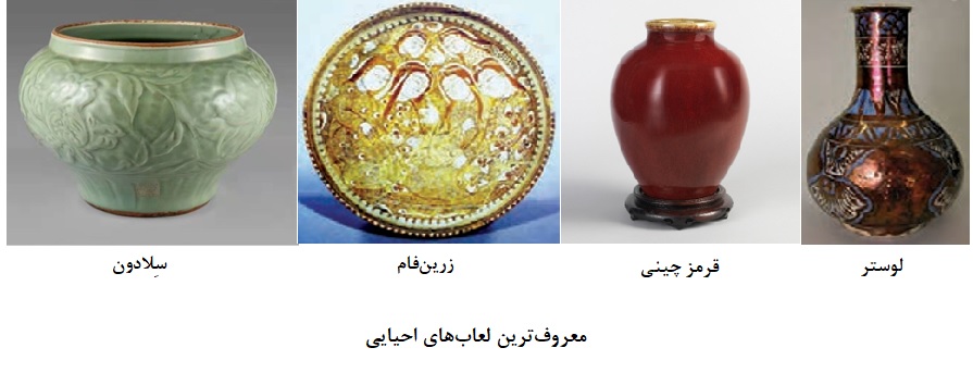 معروفترین لعابهای احیایی عبارتاند از لوستر، زرینفام، سلادون (سبز بیدی) و قرمز چینی.