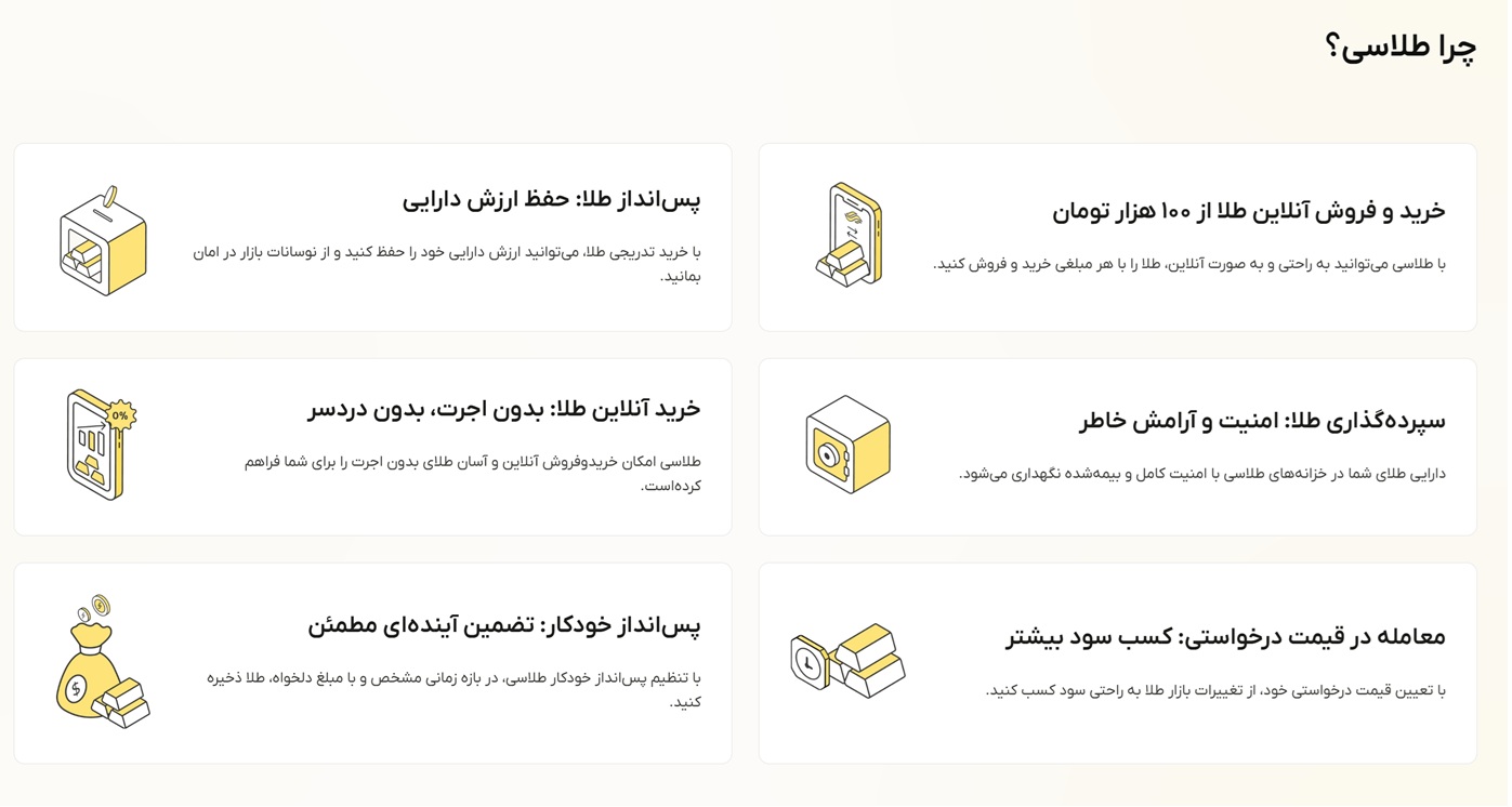 طلاسی با هدف خرید و فروش طلای آب شده، یکی از برندهای معتبر در بازار آنلاین طلاست که تمرکز خود را بر ارائه اطلاعات دقیق و تجربه خرید ساده گذاشته است. این سایت با طراحی تمیز و قابل فهم، به کاربران امکان میدهد بهسرعت و راحتی به نتیجه برسند. از نکات مثبت آن میتوان به بهروزرسانی لحظهای قیمت طلا، صدور فاکتور رسمی و پشتیبانی مؤثر اشاره کرد.